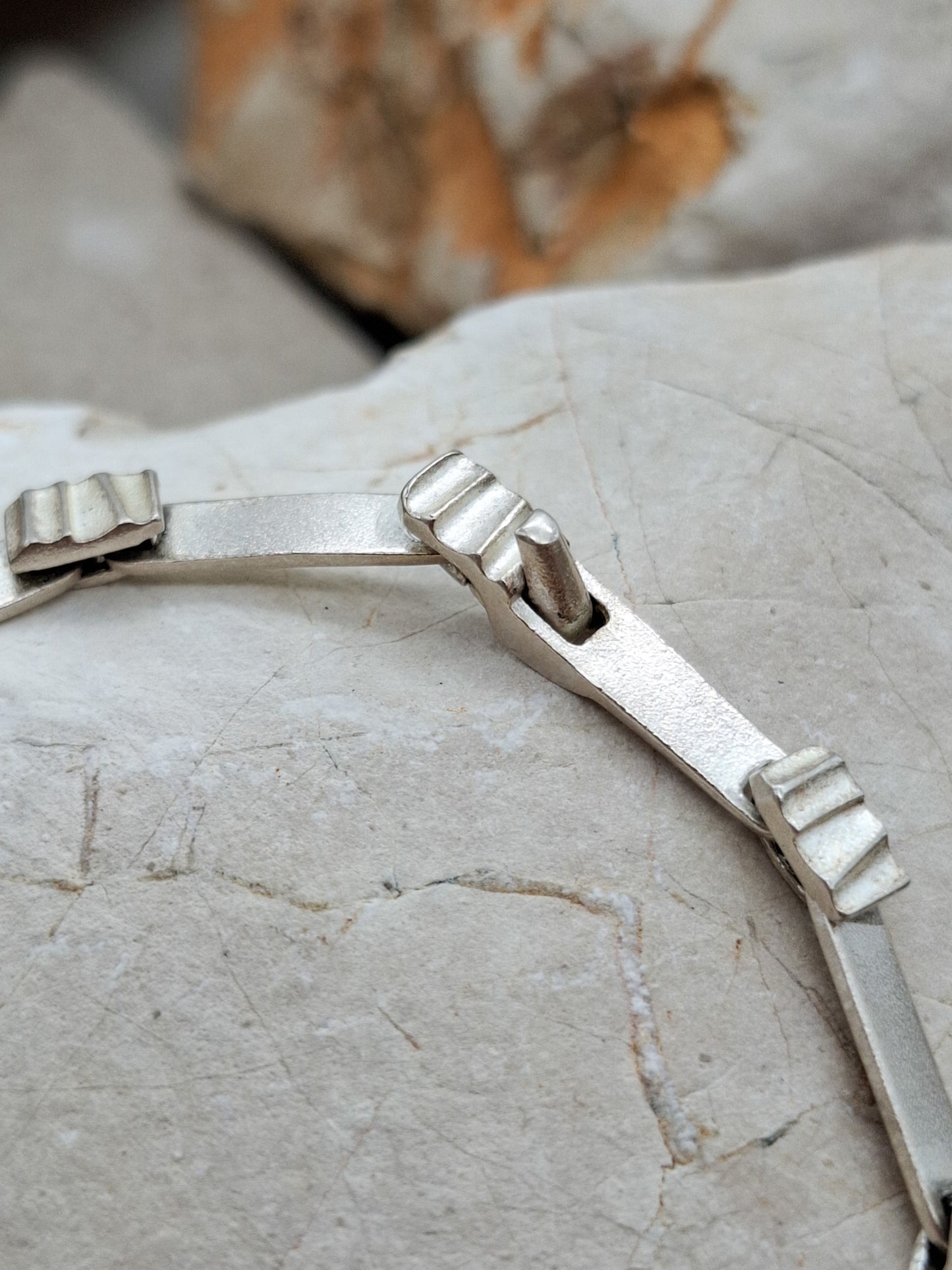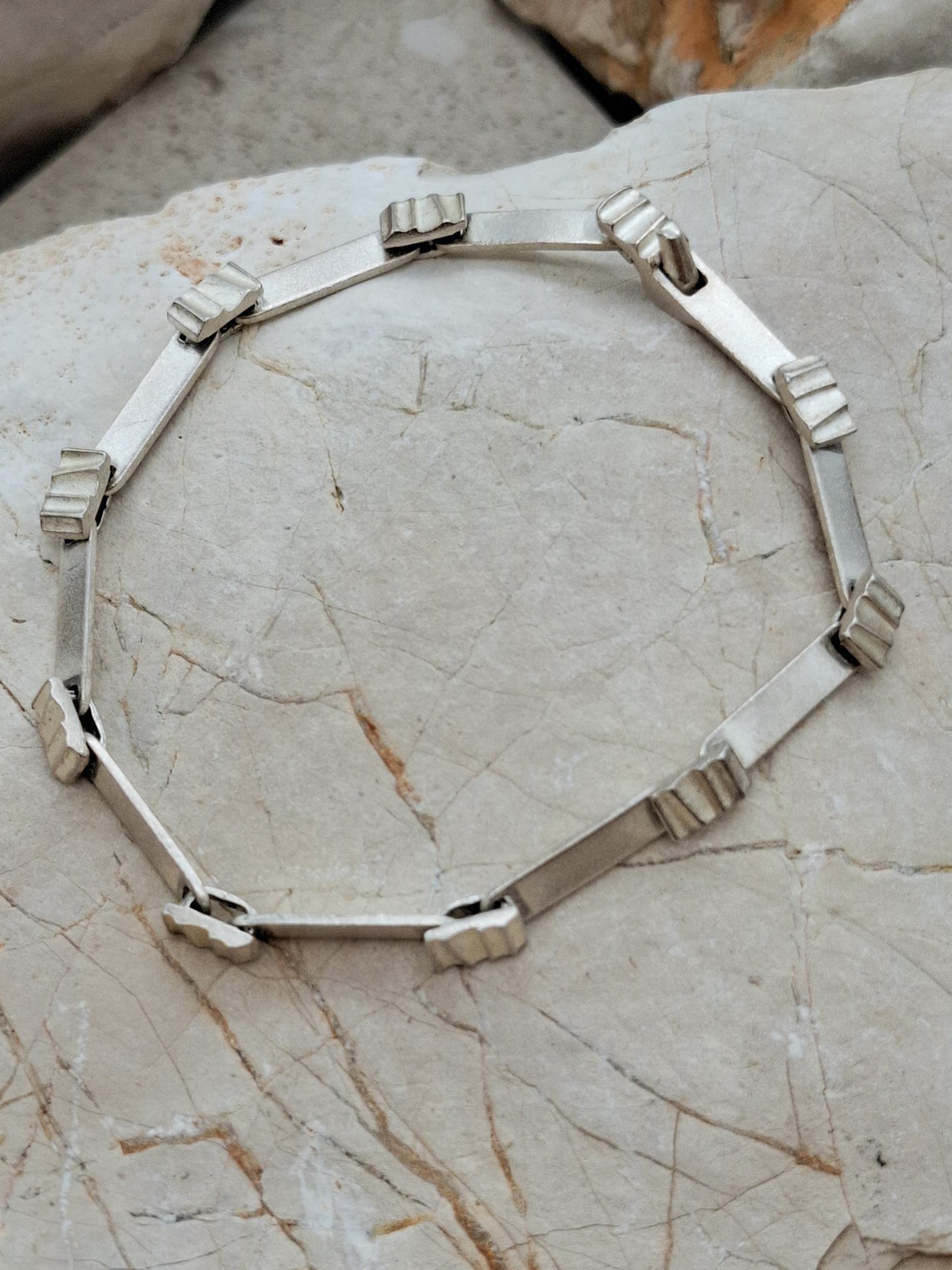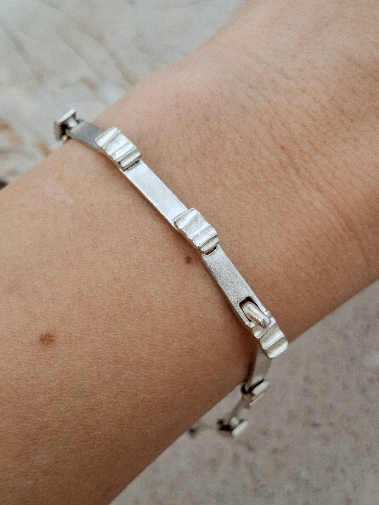 The bracelet has matte links with a rectangular wavy link on top as a connecting piece.