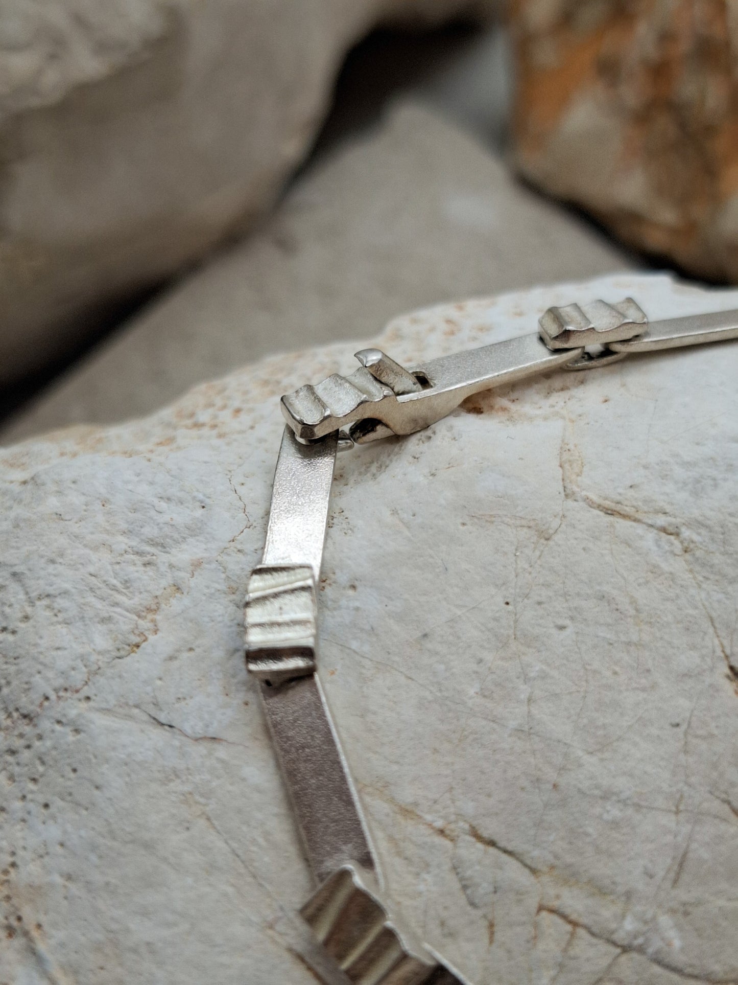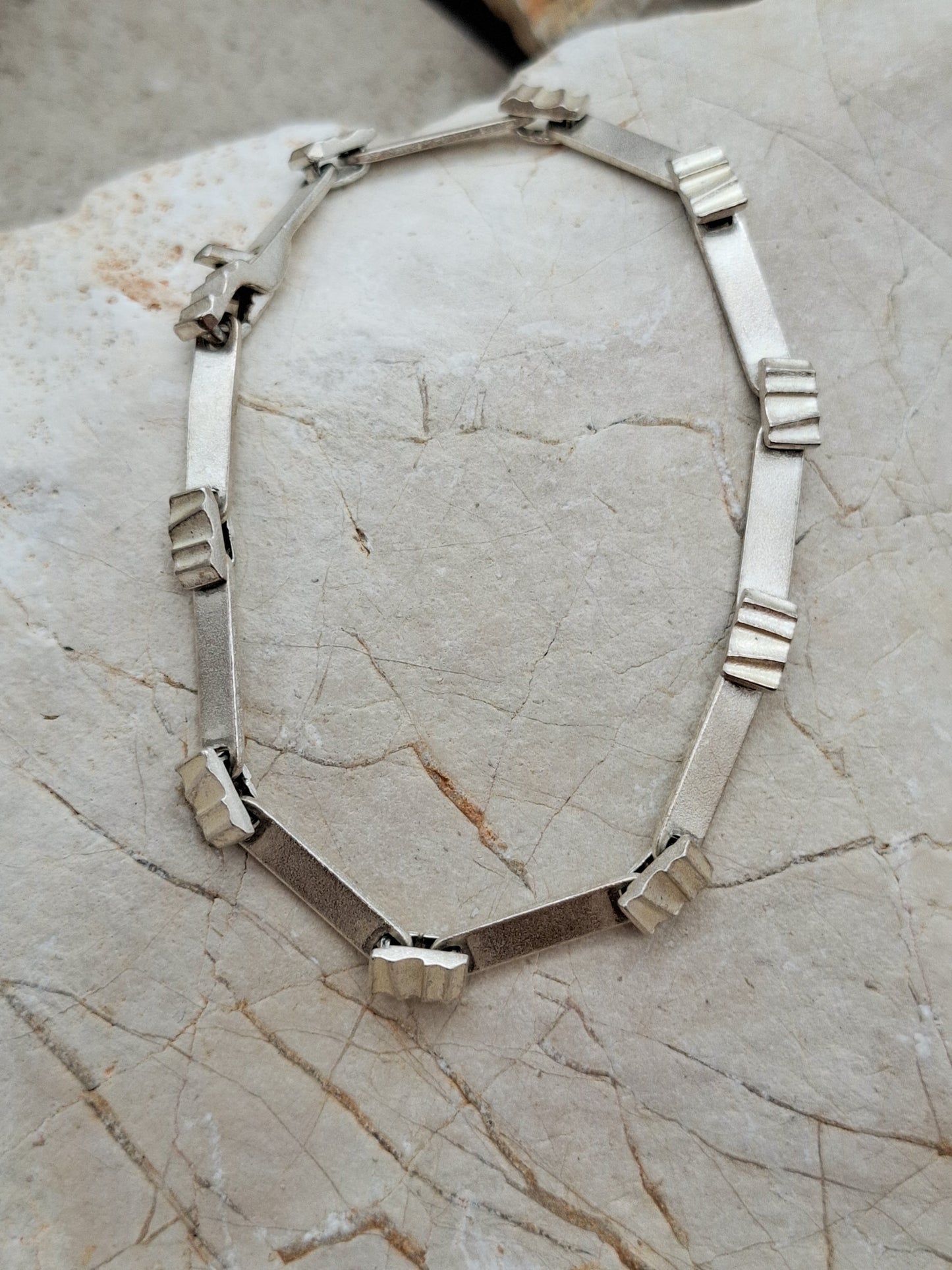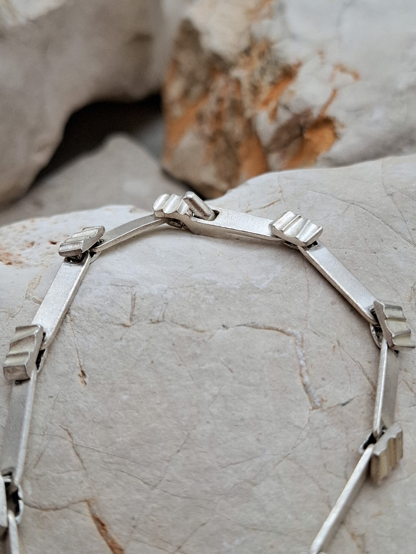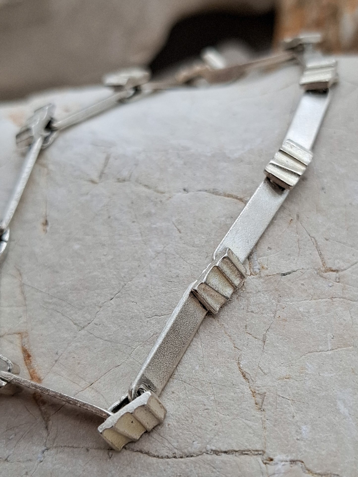 The bracelet has matte links with a rectangular wavy link on top as a connecting piece.
