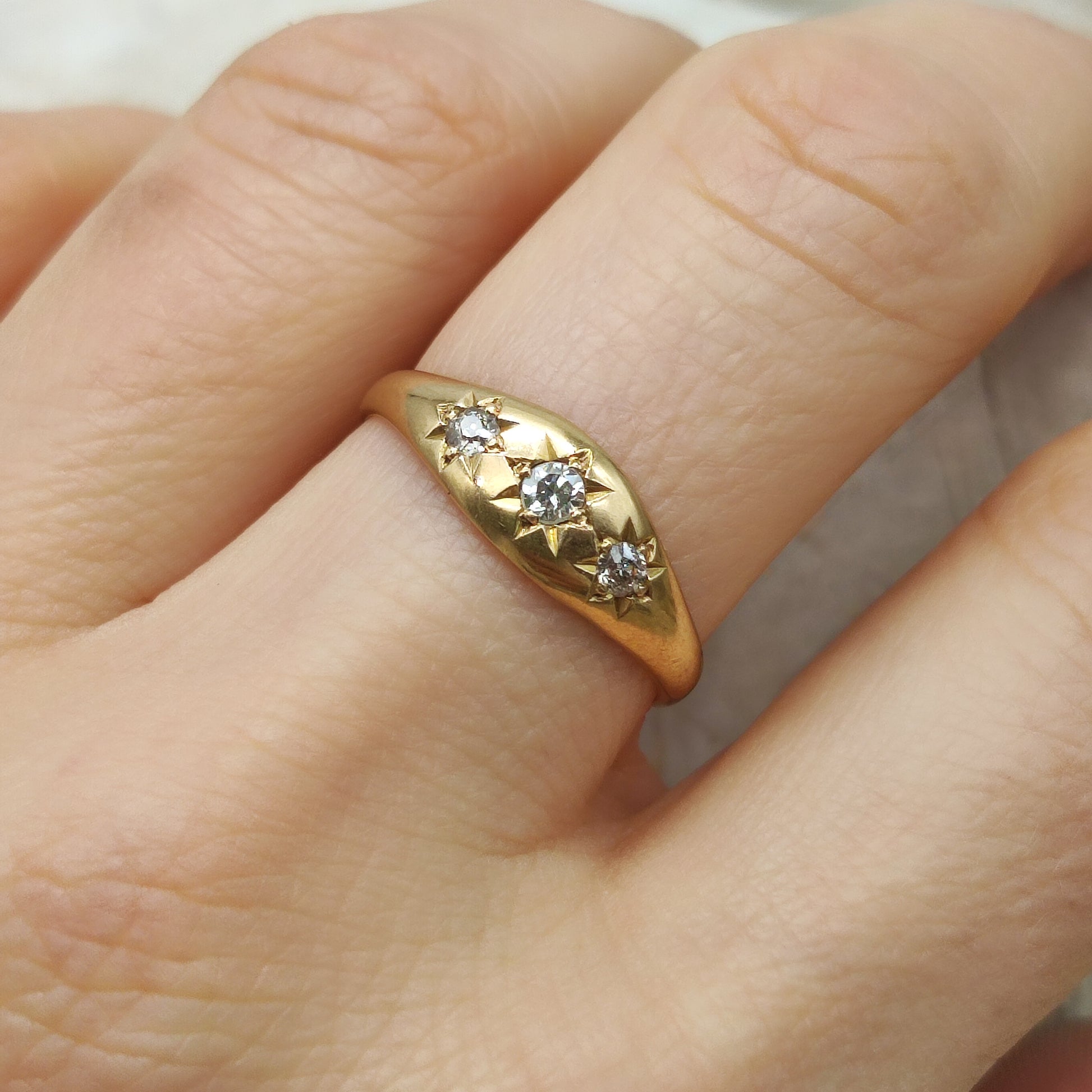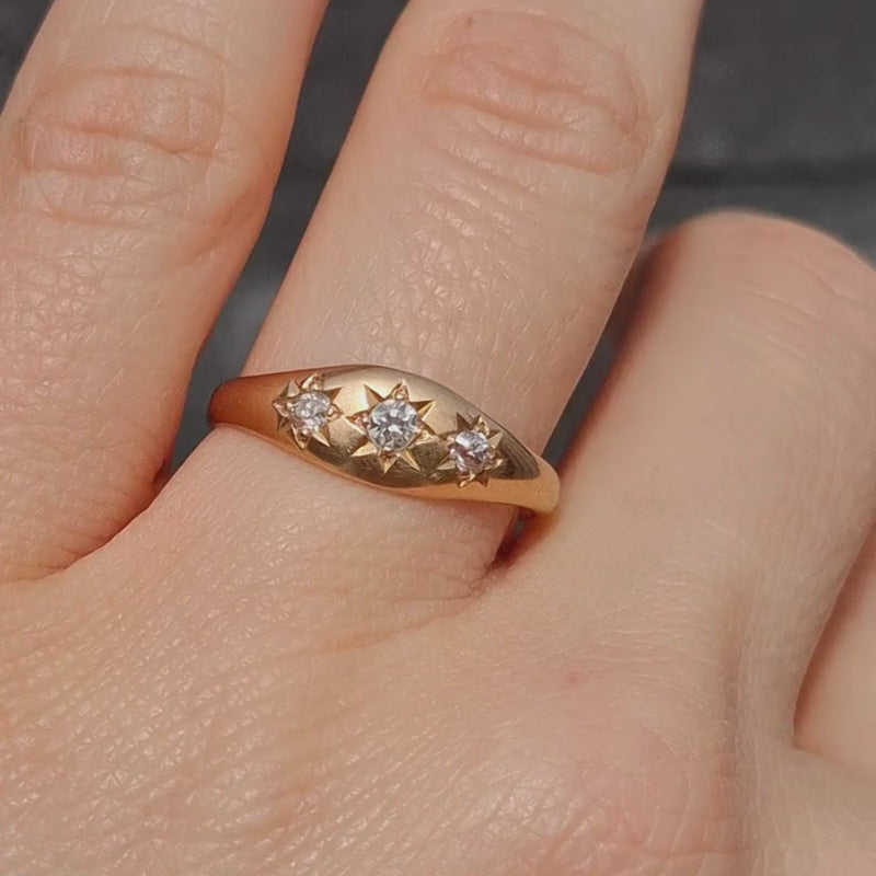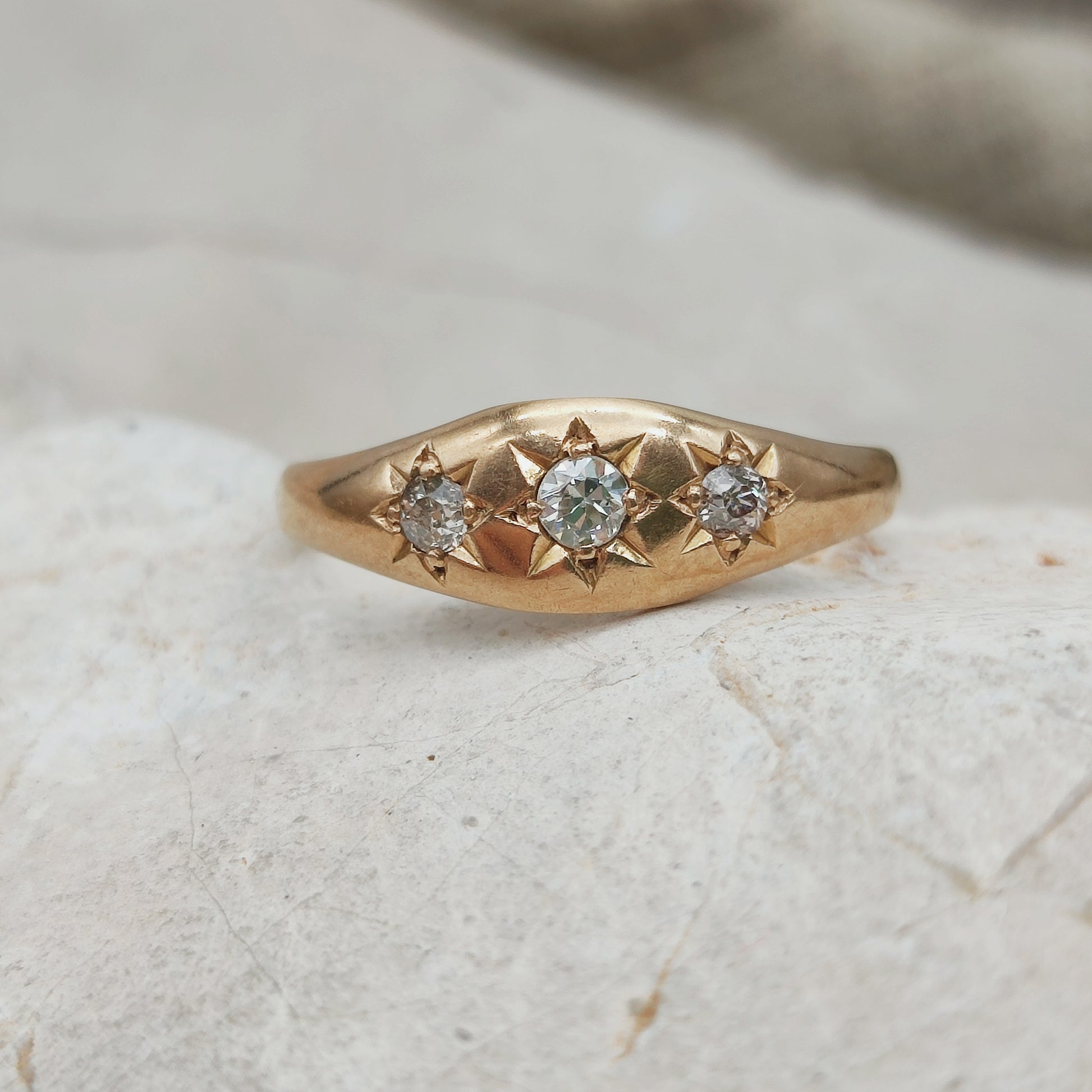 This ring features three diamonds in a star setting . The star-shaped engraving around each stone allows the light to play beautifully on the gold, adding character to the design. This type of setting was traditionally used in antique gypsy rings and remains recognizable today.