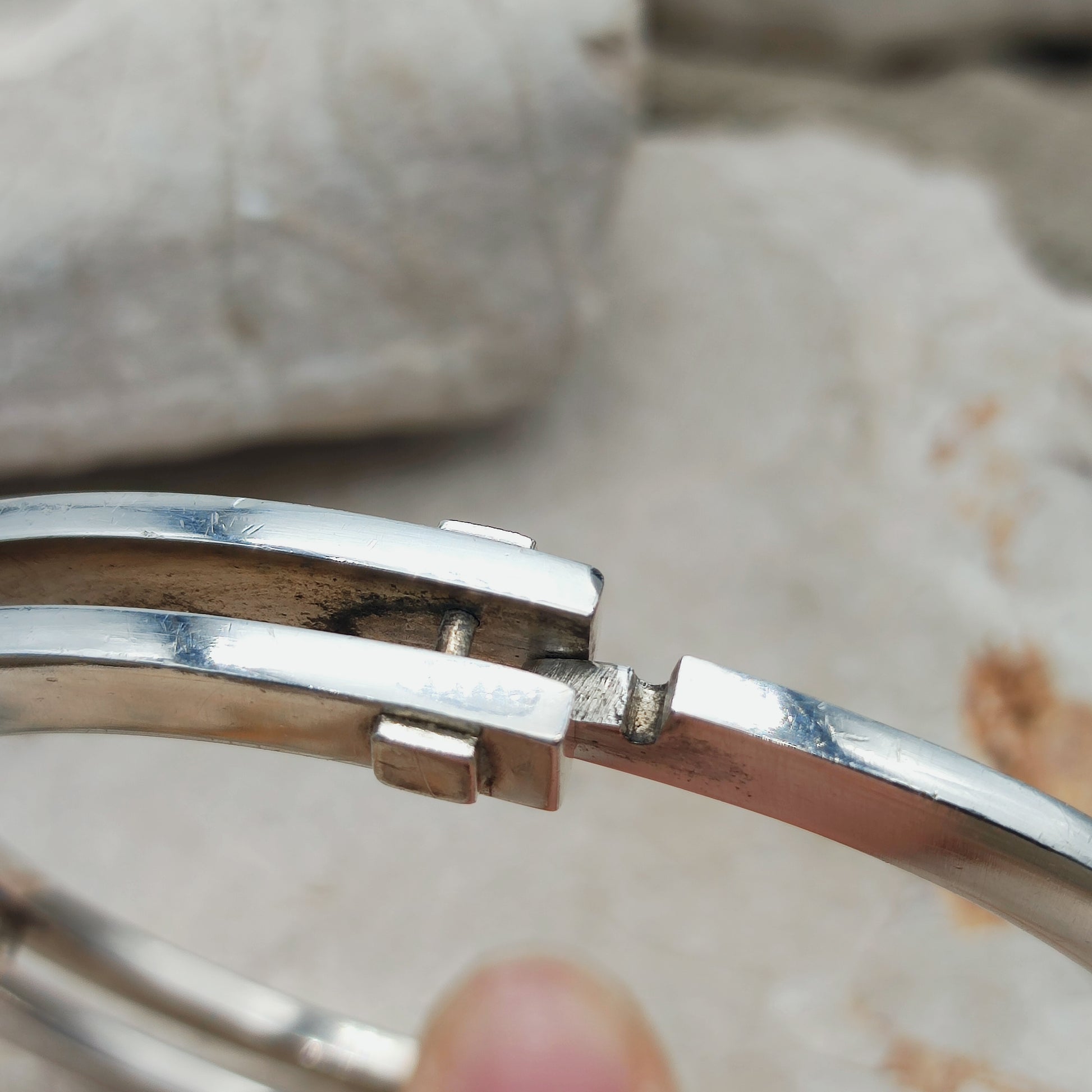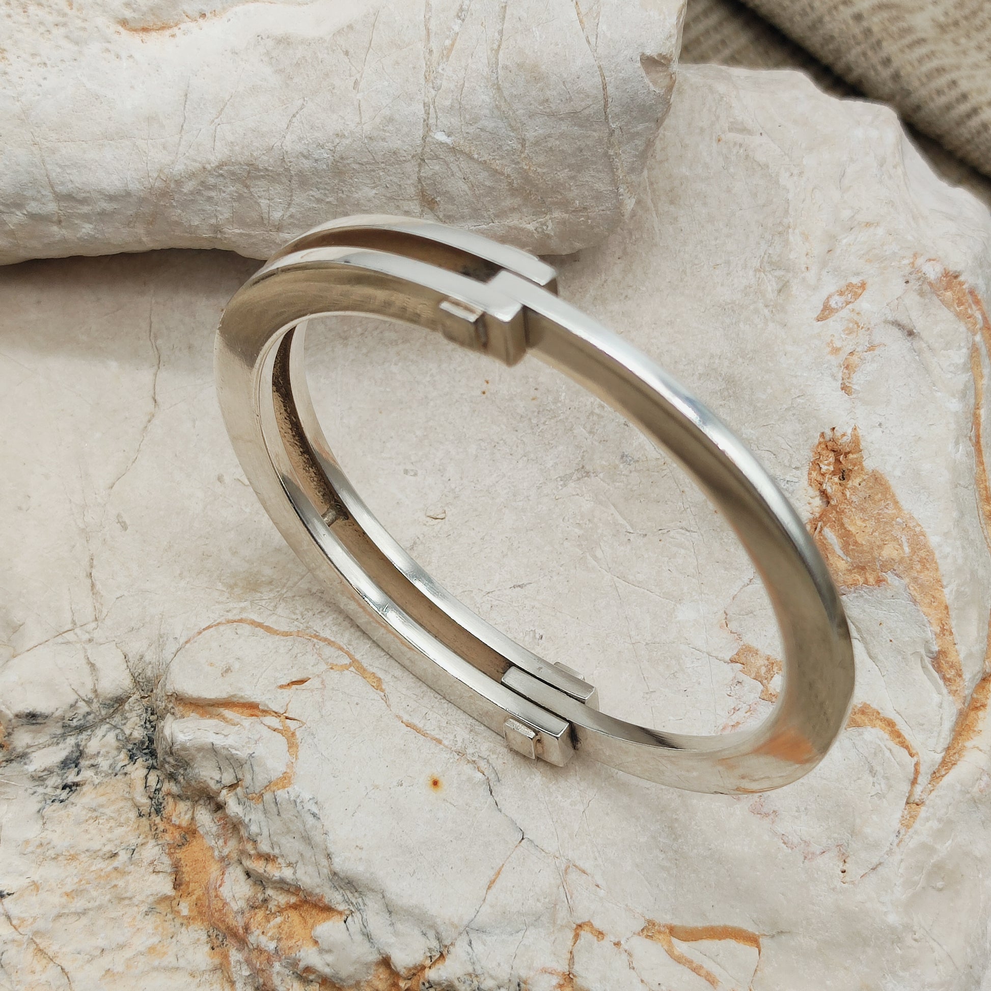 De vorm is ovaal en volgt de lijn van de pols. De overgang tussen beide delen gebeurt via een scharnierconstructie met blokvormige elementen. De sluiting werkt door de enkele band in de dubbele zijde te klikken. Dit vraagt wat druk en zorgt voor een stevige sluiting zonder extra slot.