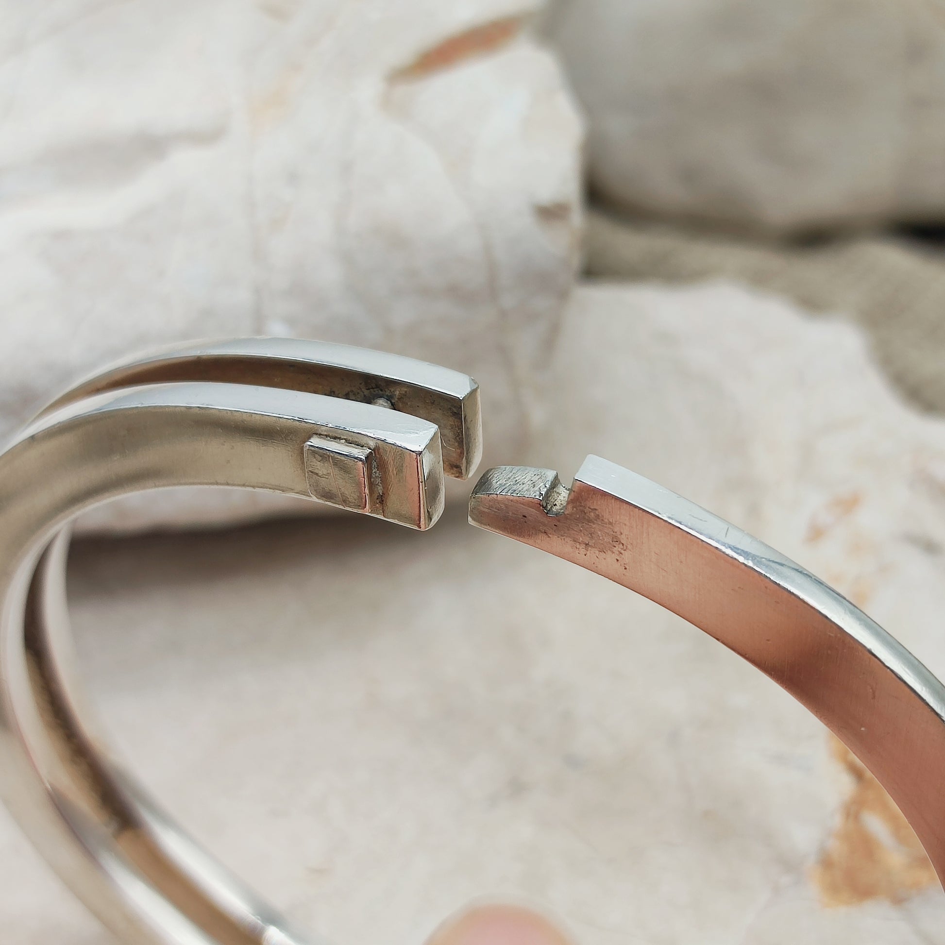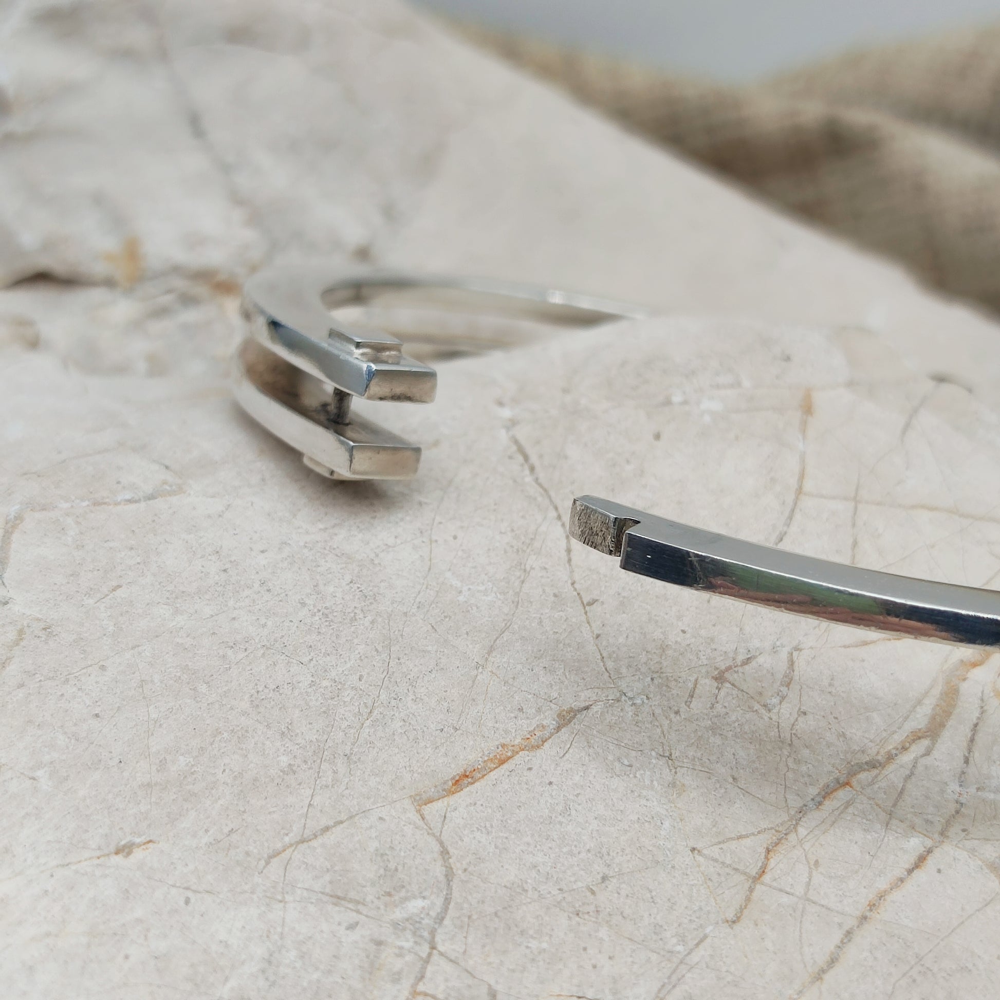 Een zilveren armband van Hans Hansen met een asymmetrische opbouw: aan de ene zijde een dubbele band, aan de andere zijde een enkele.