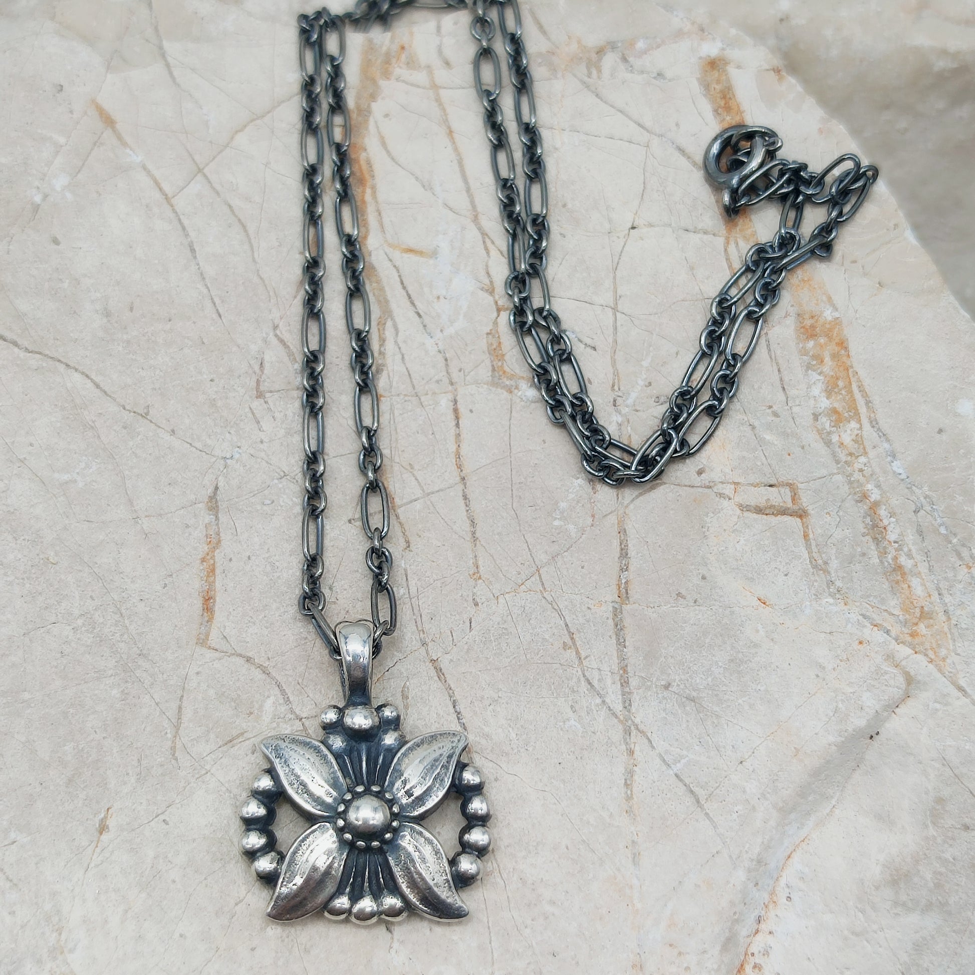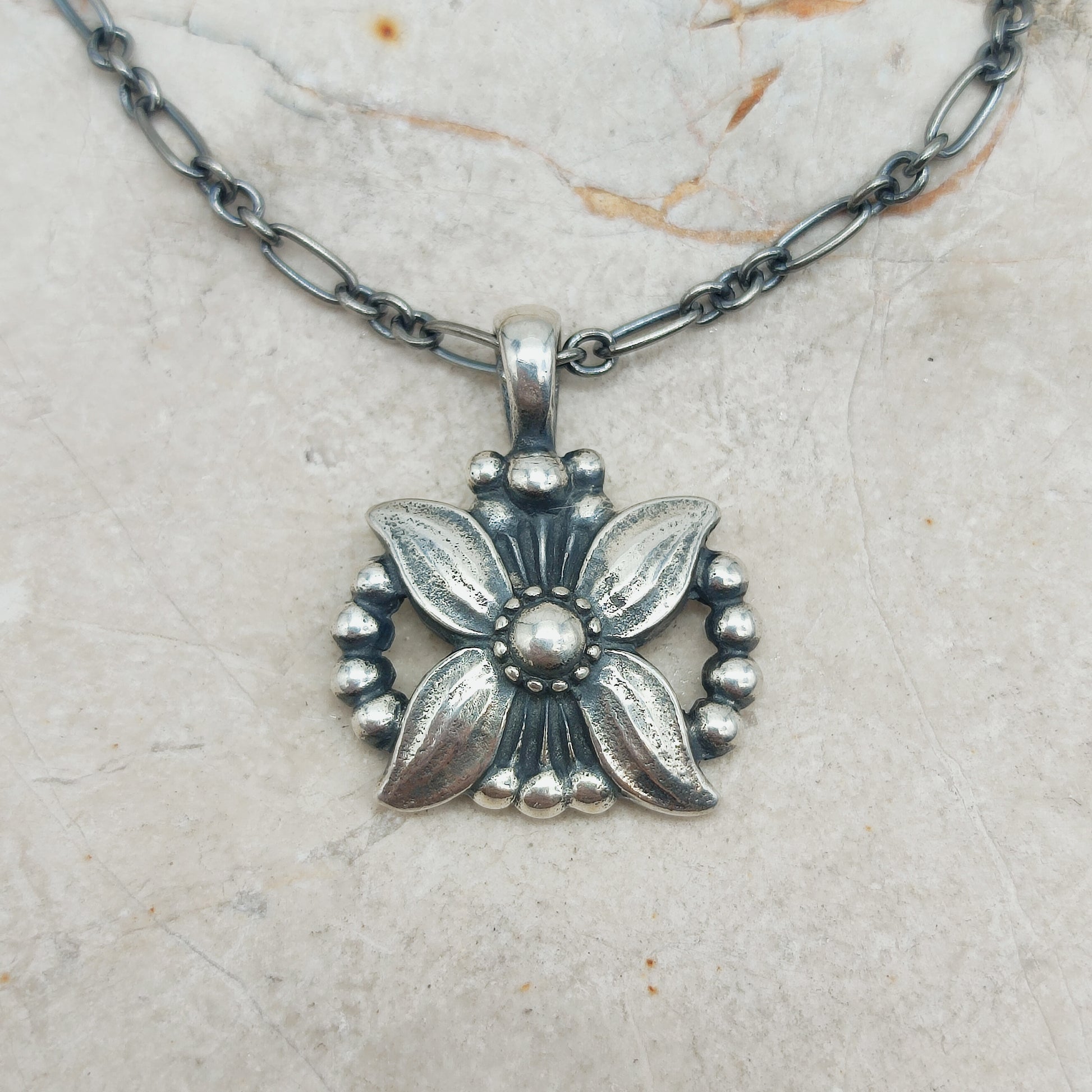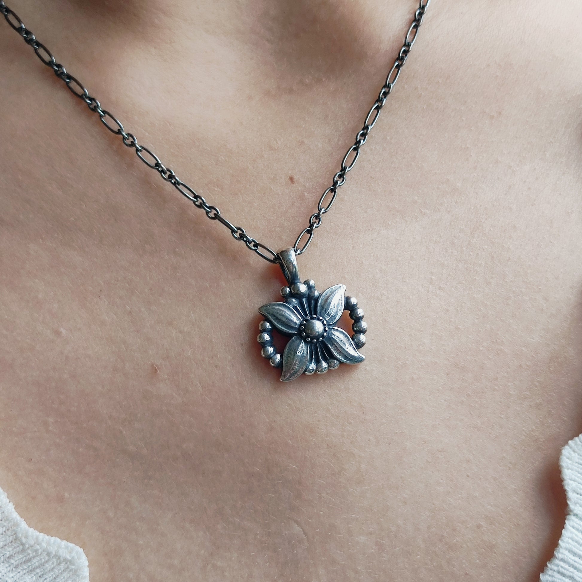 Zowel hanger als ketting hebben een donkere, licht geoxideerde afwerking. Dat is geen vuil of slijtage, maar een bewuste afwerking die het reliëf en de vormen extra diepte geeft.