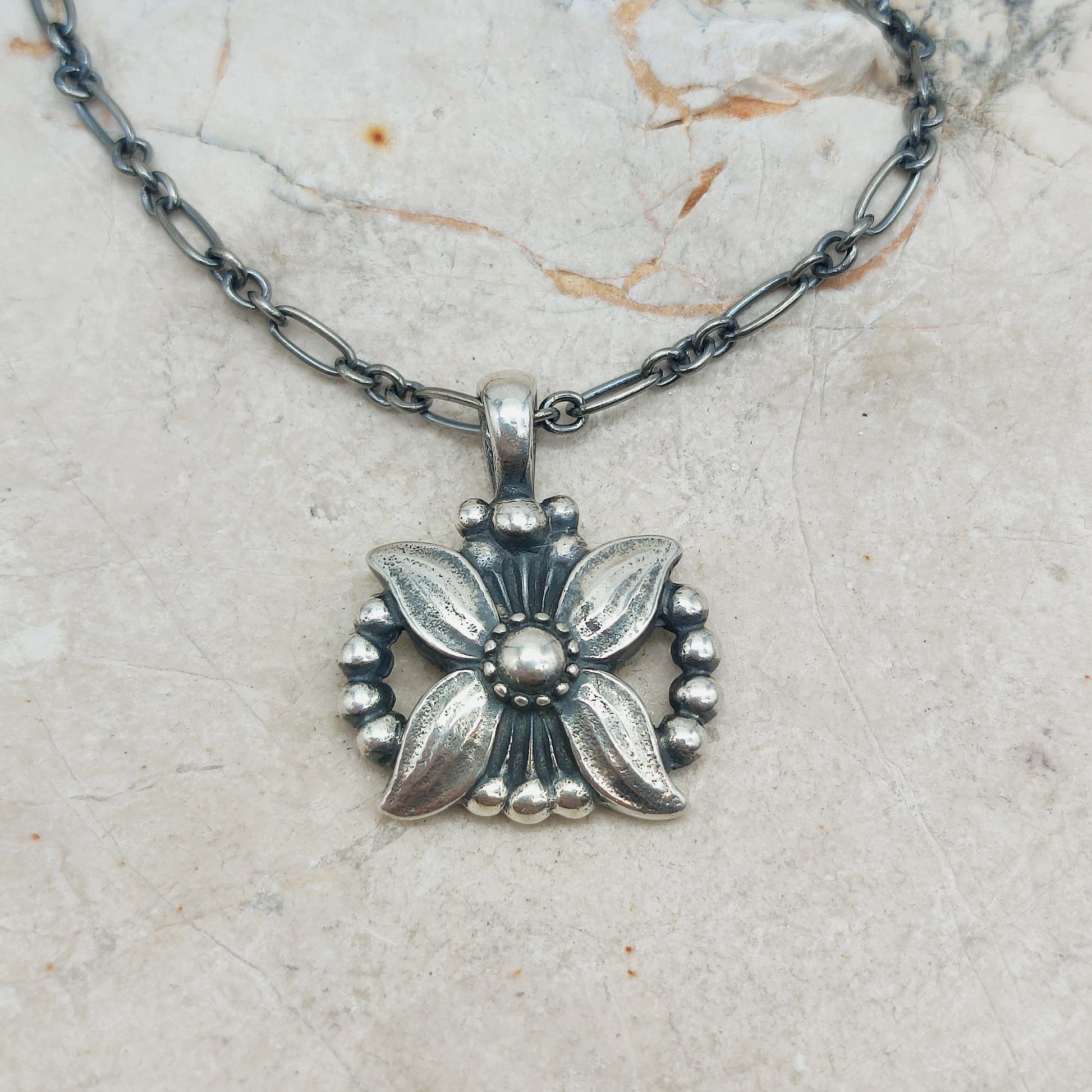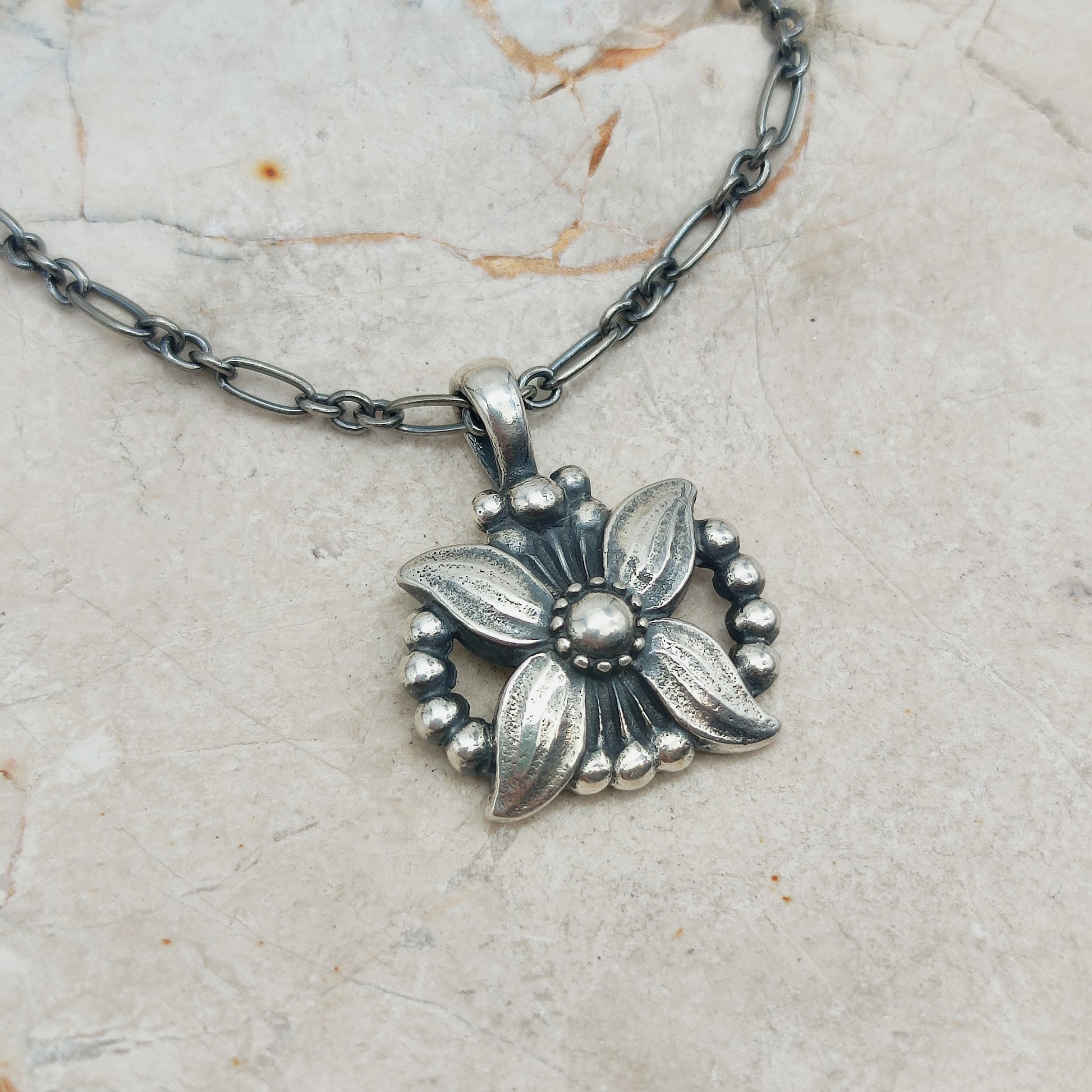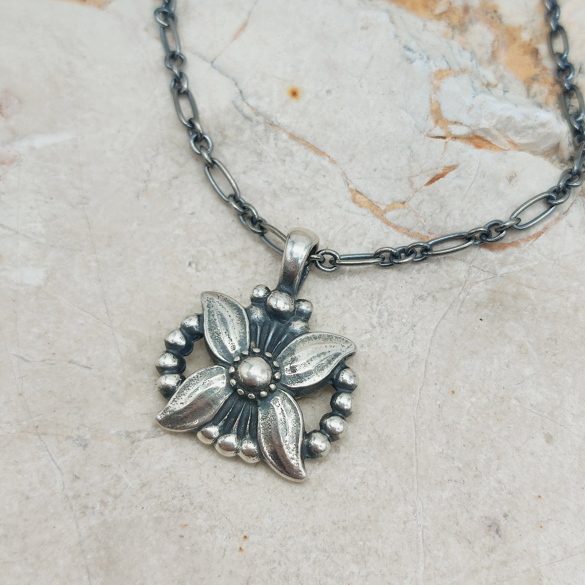 Zowel hanger als ketting hebben een donkere, licht geoxideerde afwerking. Dat is geen vuil of slijtage, maar een bewuste afwerking die het reliëf en de vormen extra diepte geeft.