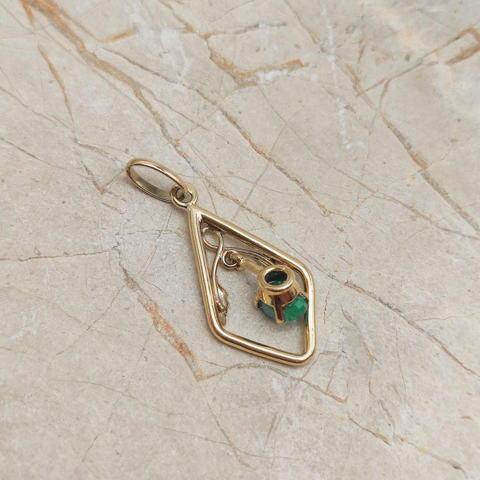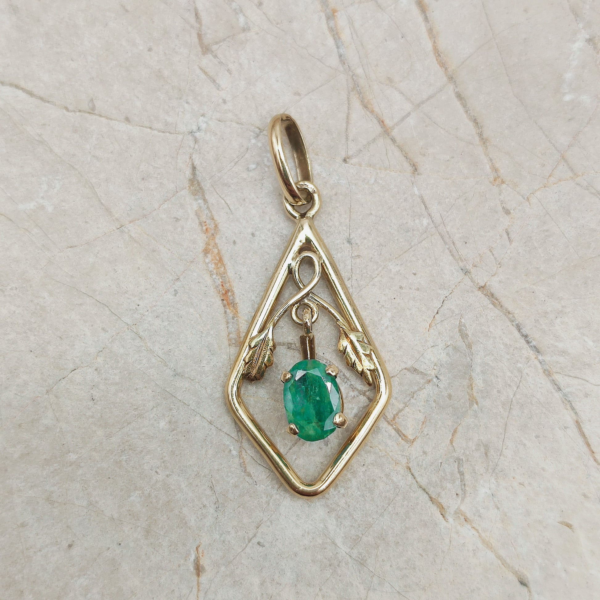 Deze hanger dateert van begin 1900-1910 en is afkomstig uit Frankrijk.  De hanger is prachtig elegant gemaakt met een ruitachtige vorm met blaadjes en een hanger middenin.  De smaragd hangt in het midden aan een hangertje.