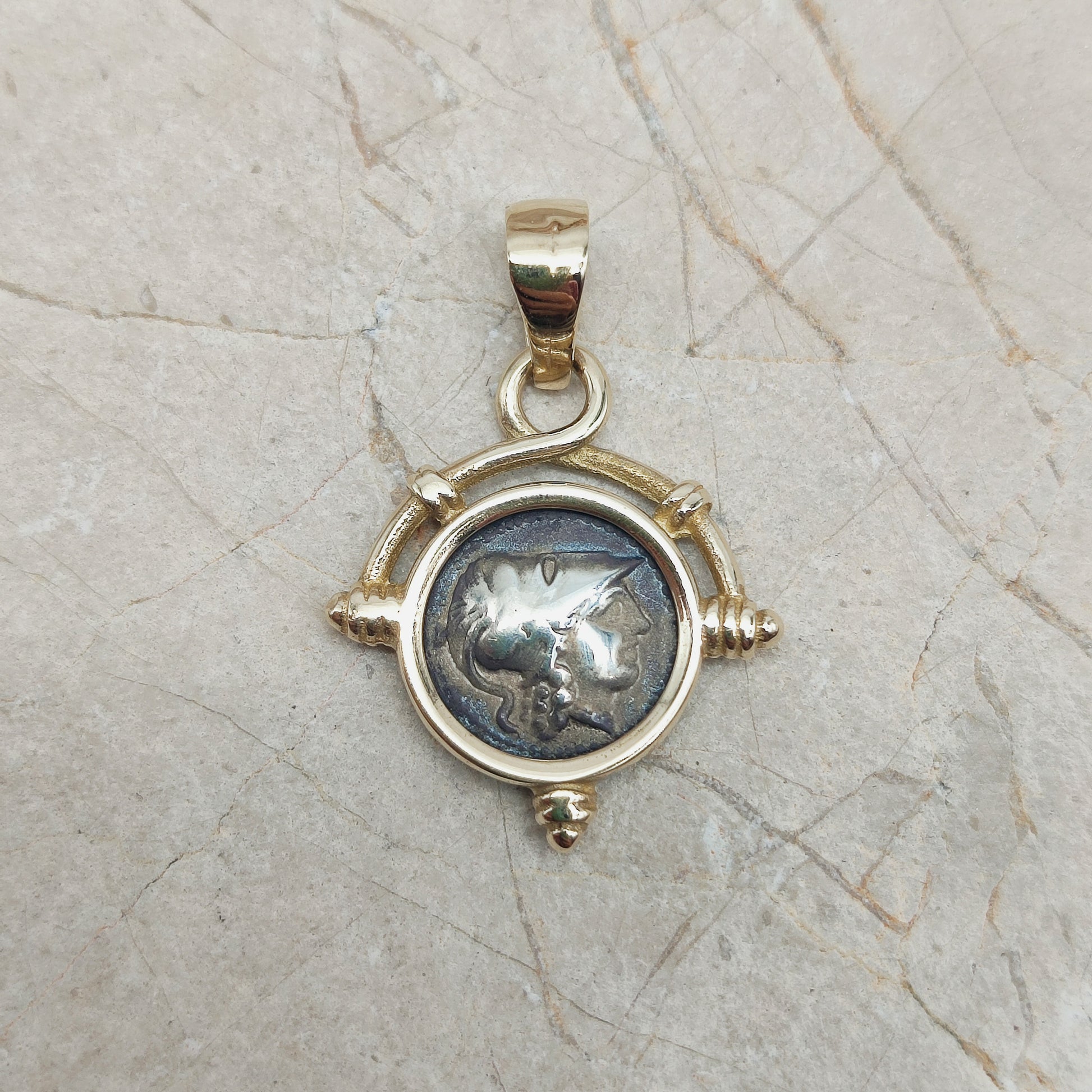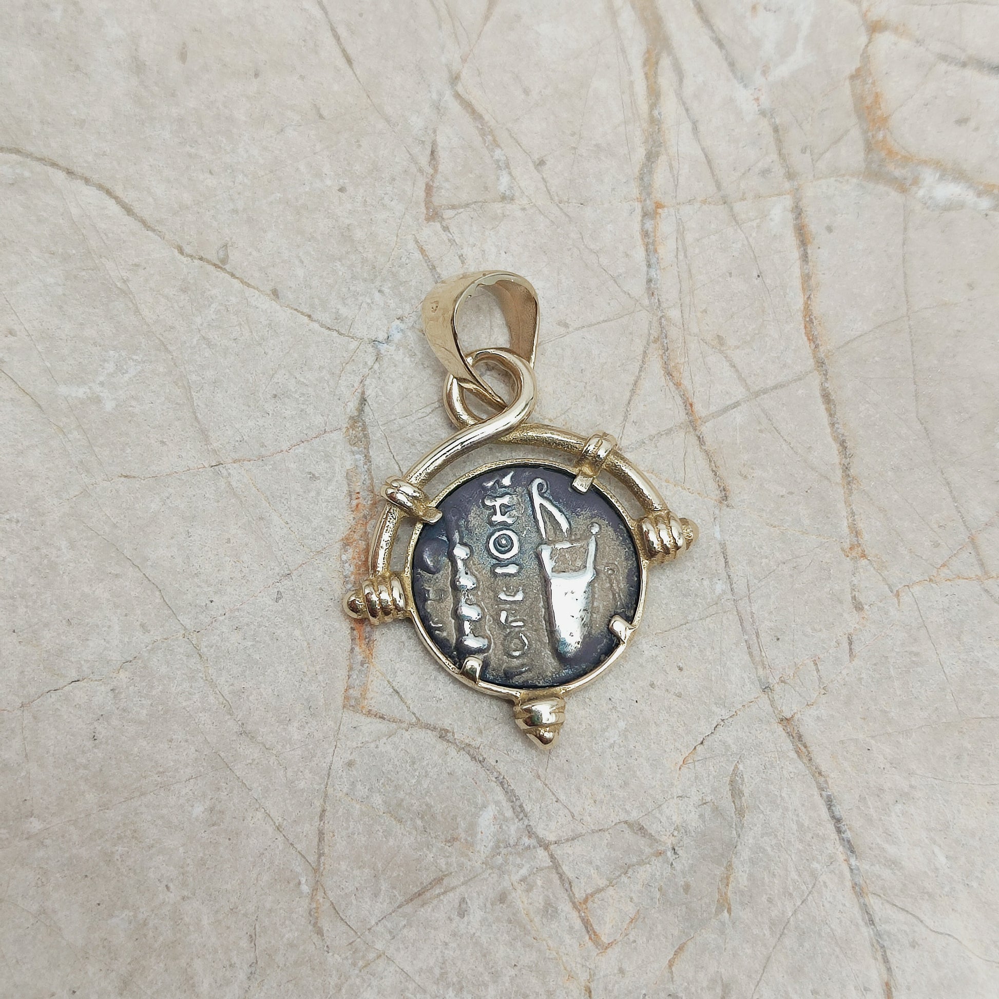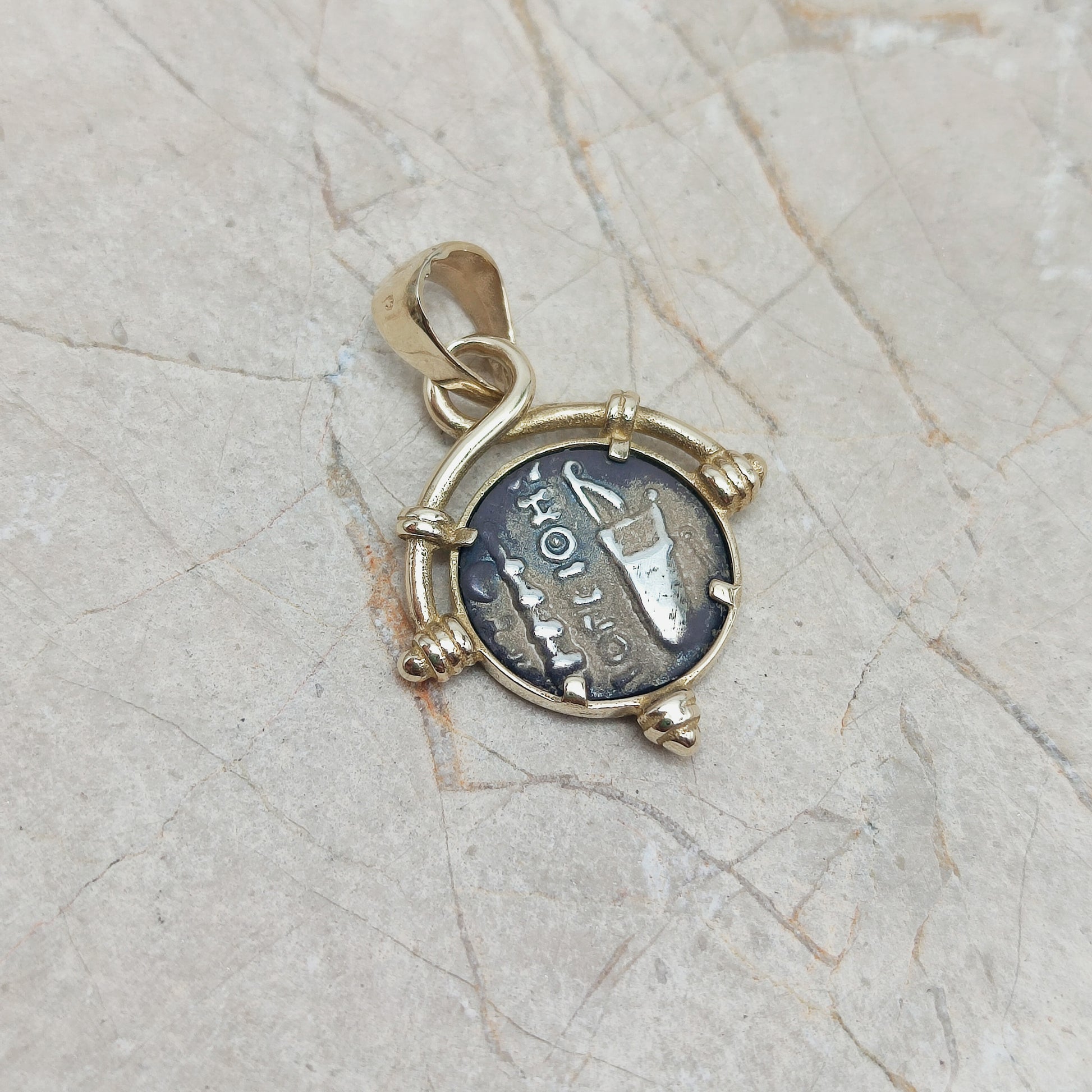 De hanger heeft in het midden een zilveren Grieks muntje en is gezet in een 8 Karaat geel gouden zetting.