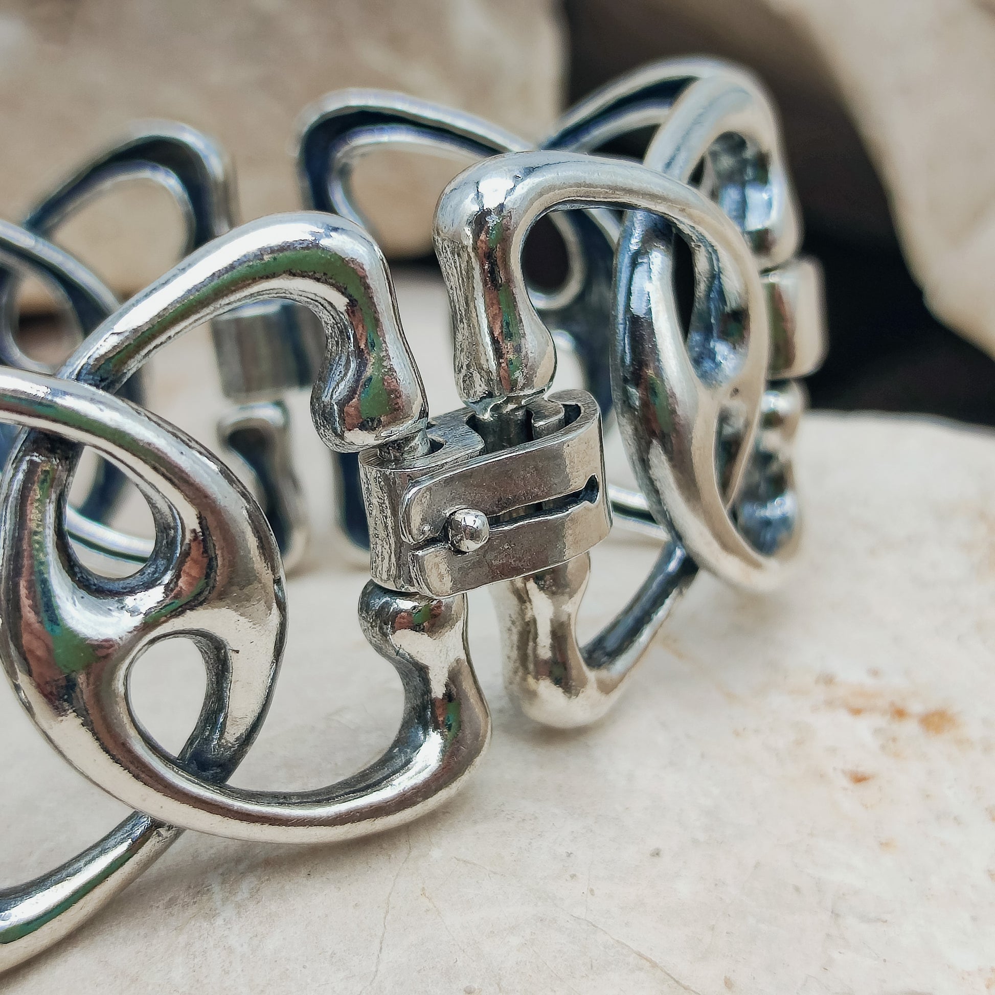 De armband bestaat uit vloeiende schakels die een beetje lijken op een stijgbeugel in combinatie met een koffieboonschakel, en dan sierlijk in elkaar gewoven. De armband sluit met een vouwslot.