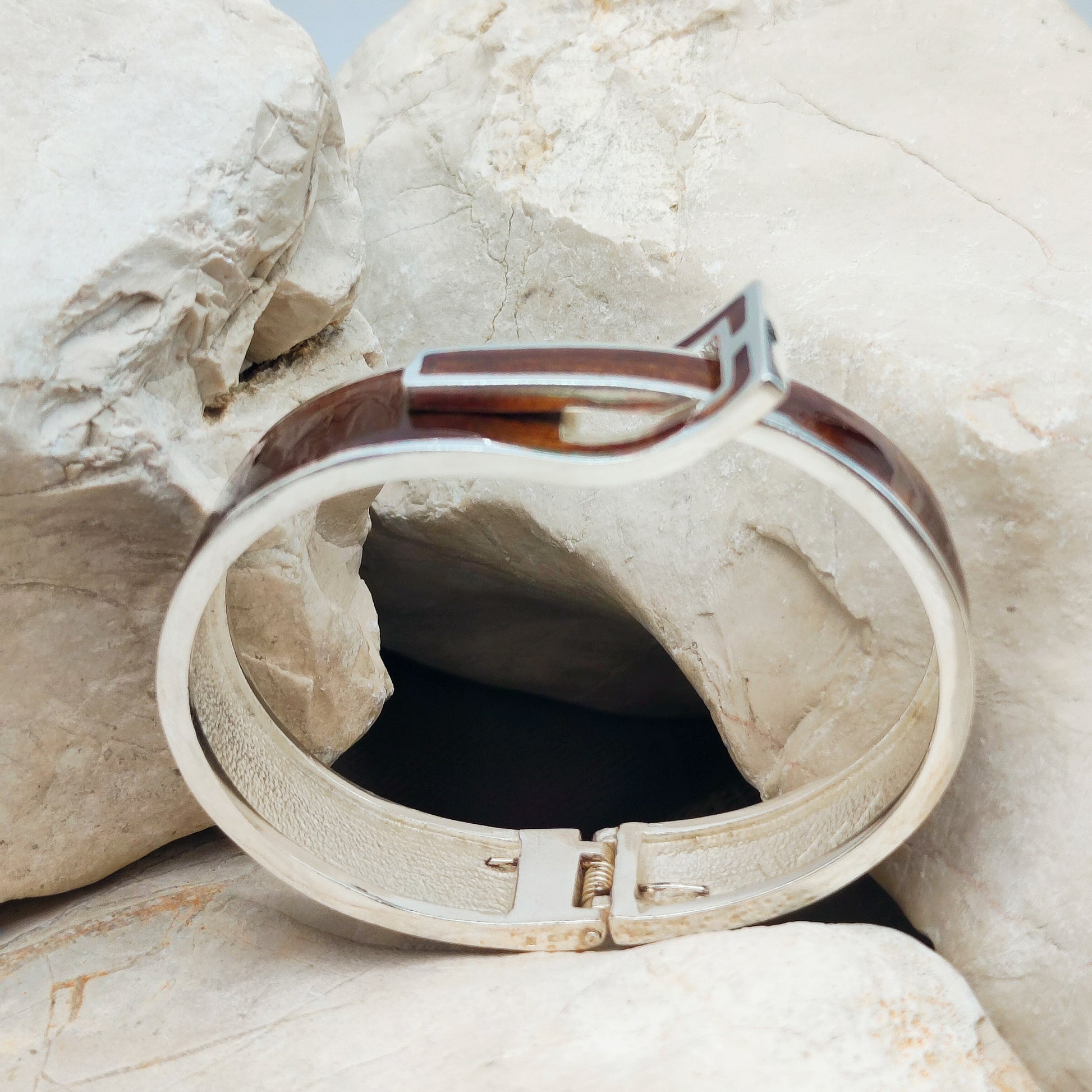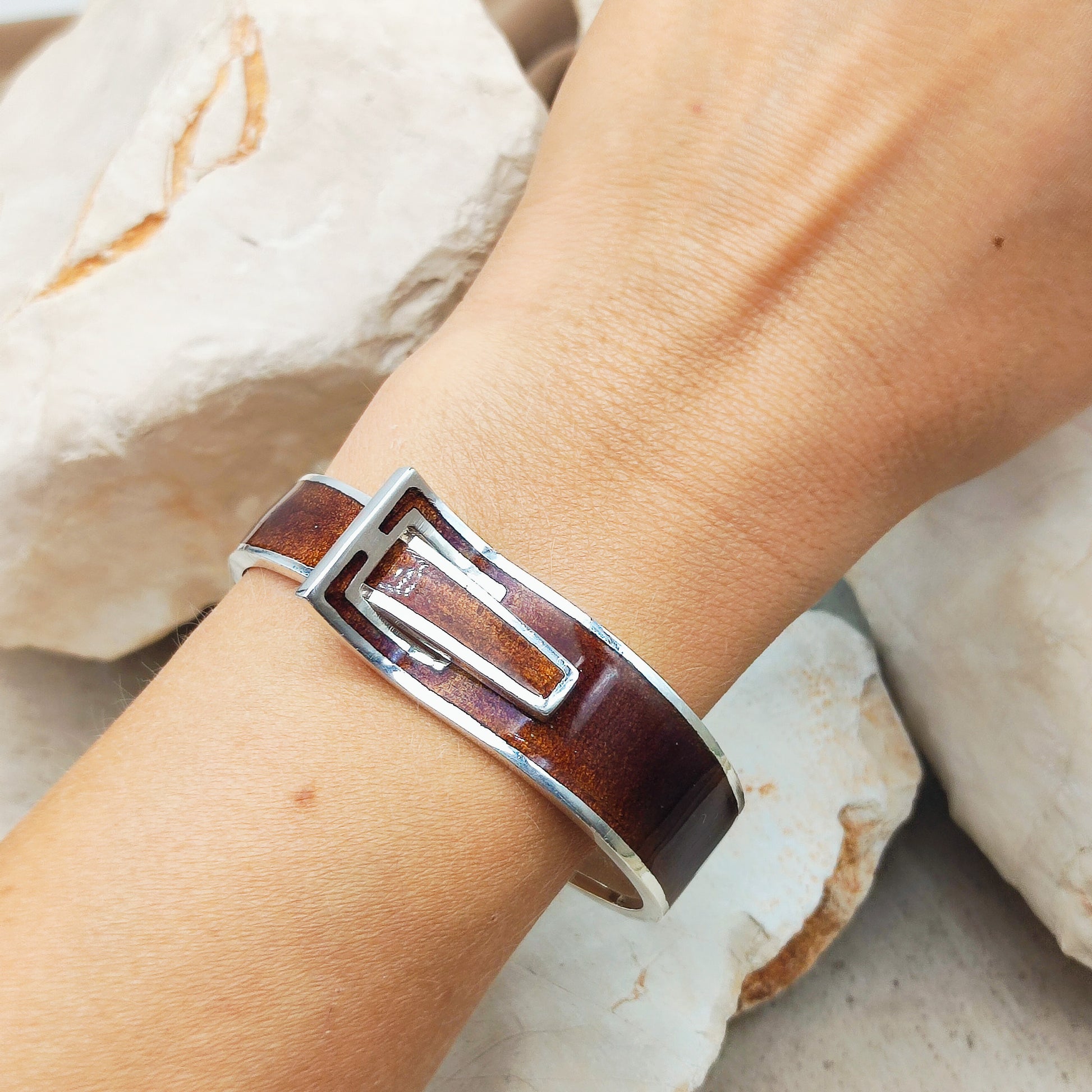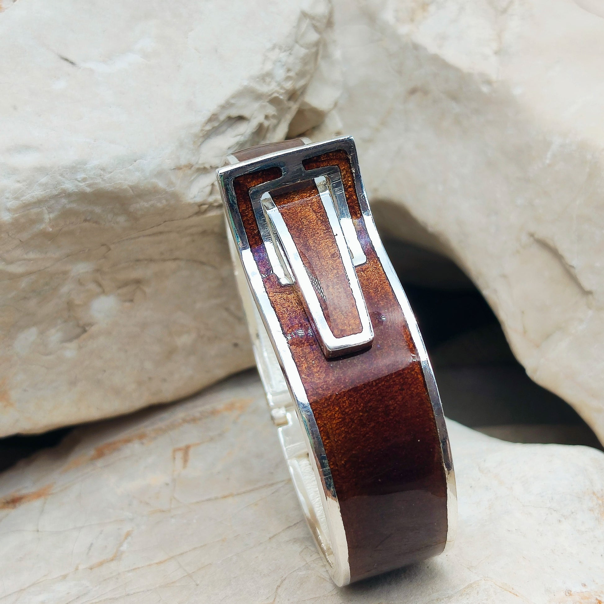 De armband is heel mooi afgewerkt met bruin email enkel de randen zijn zilver gelaten.  Het email is in een uitzonderlijk goede staat en heeft geen chips.