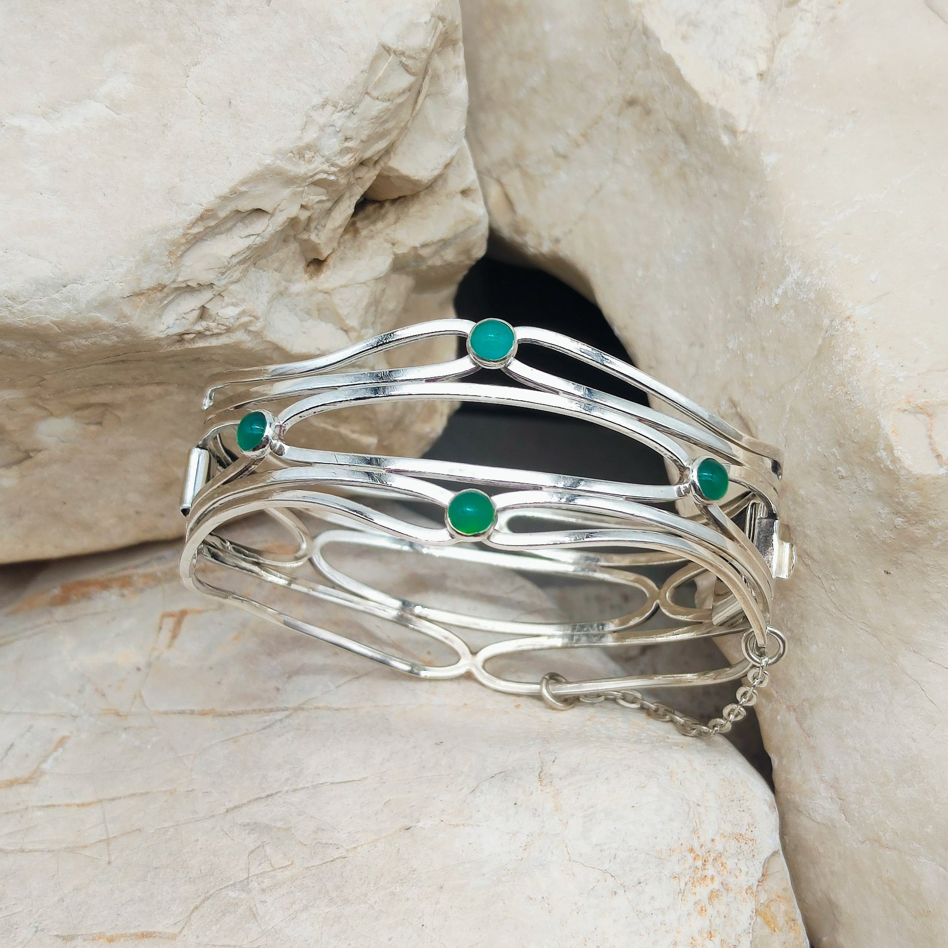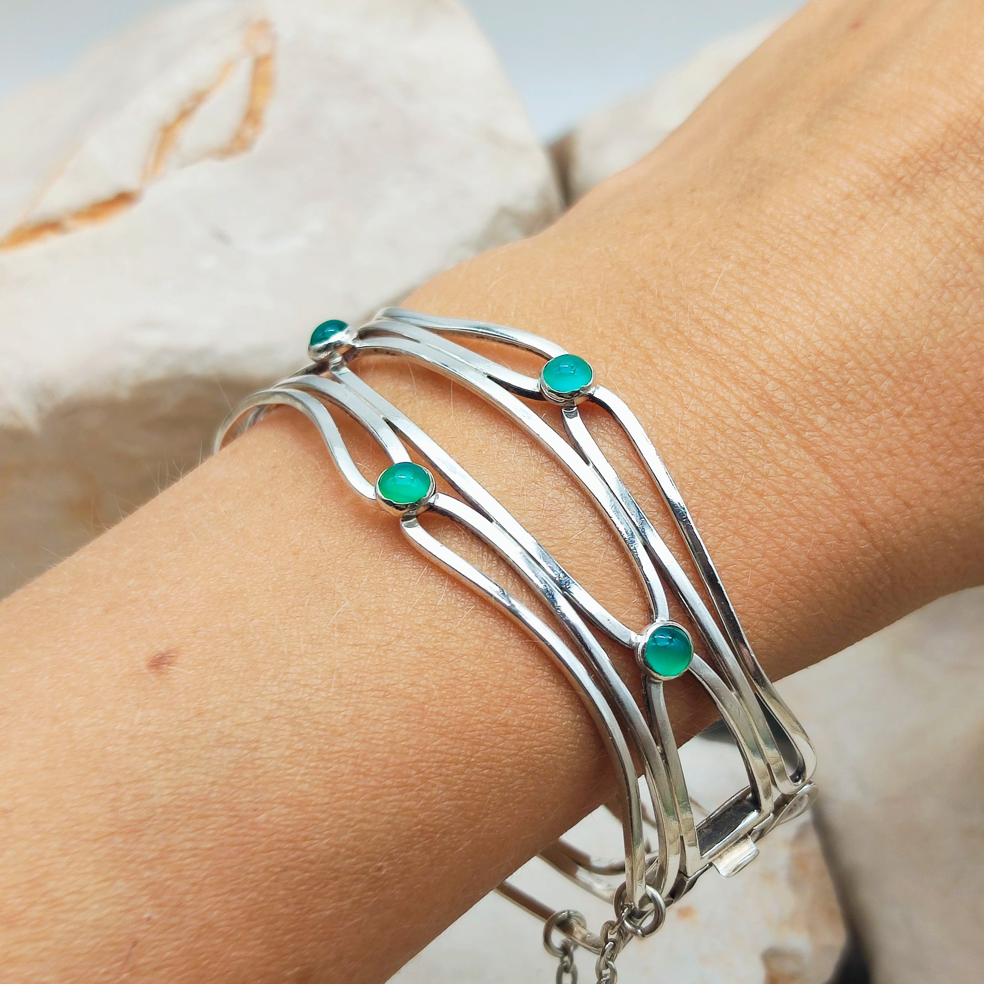 De armband is heel sierlijk en volledig in de flow lijkt me.  Ze heeft mooie vloeiende lijnen met 4 groene agaten bovenop.  Aan de onderkant heeft ze hetzelfde patroon maar dan zonder stenen.