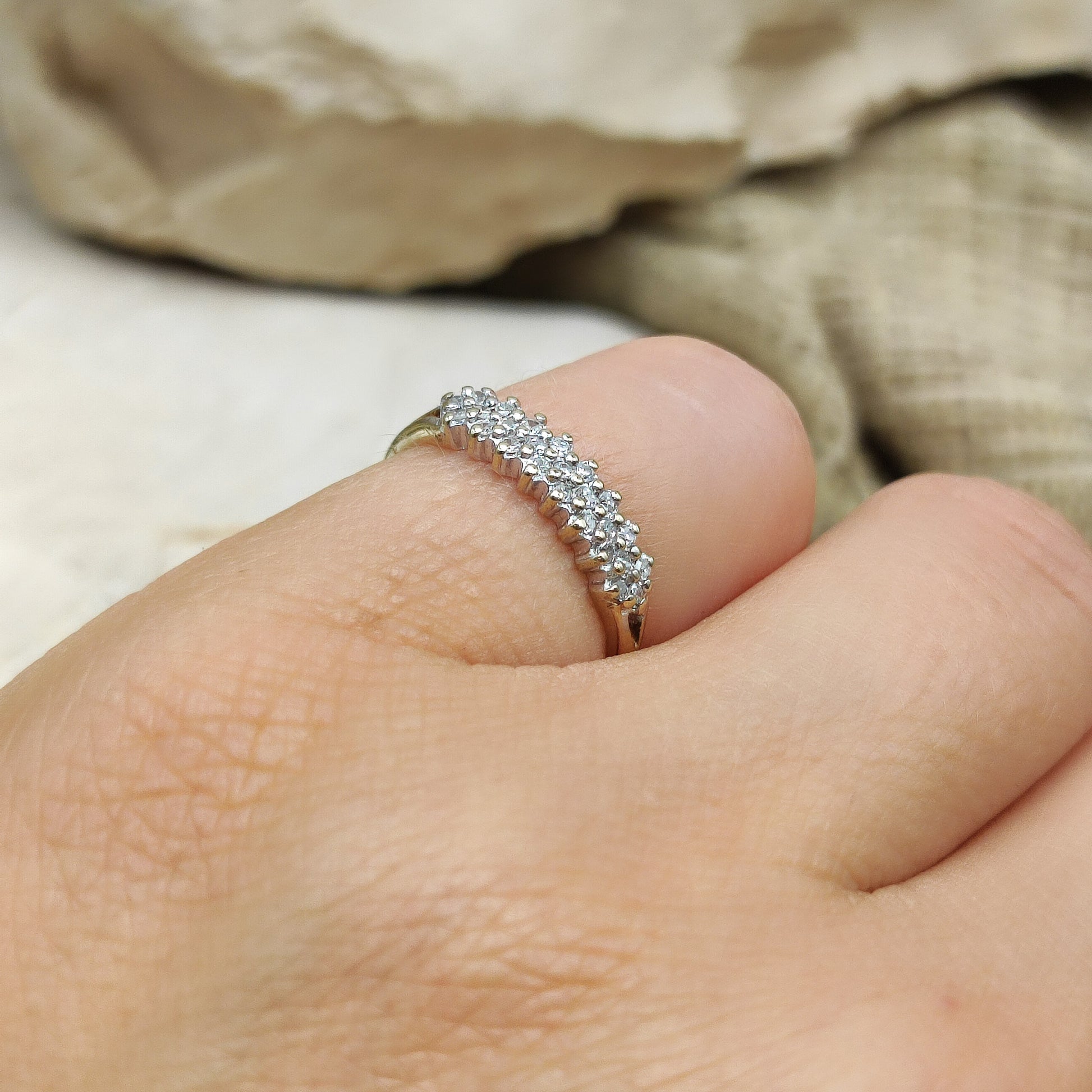 De ring 3 rijen diamantjes, gezet in wit goud met een geel gouden ringband.