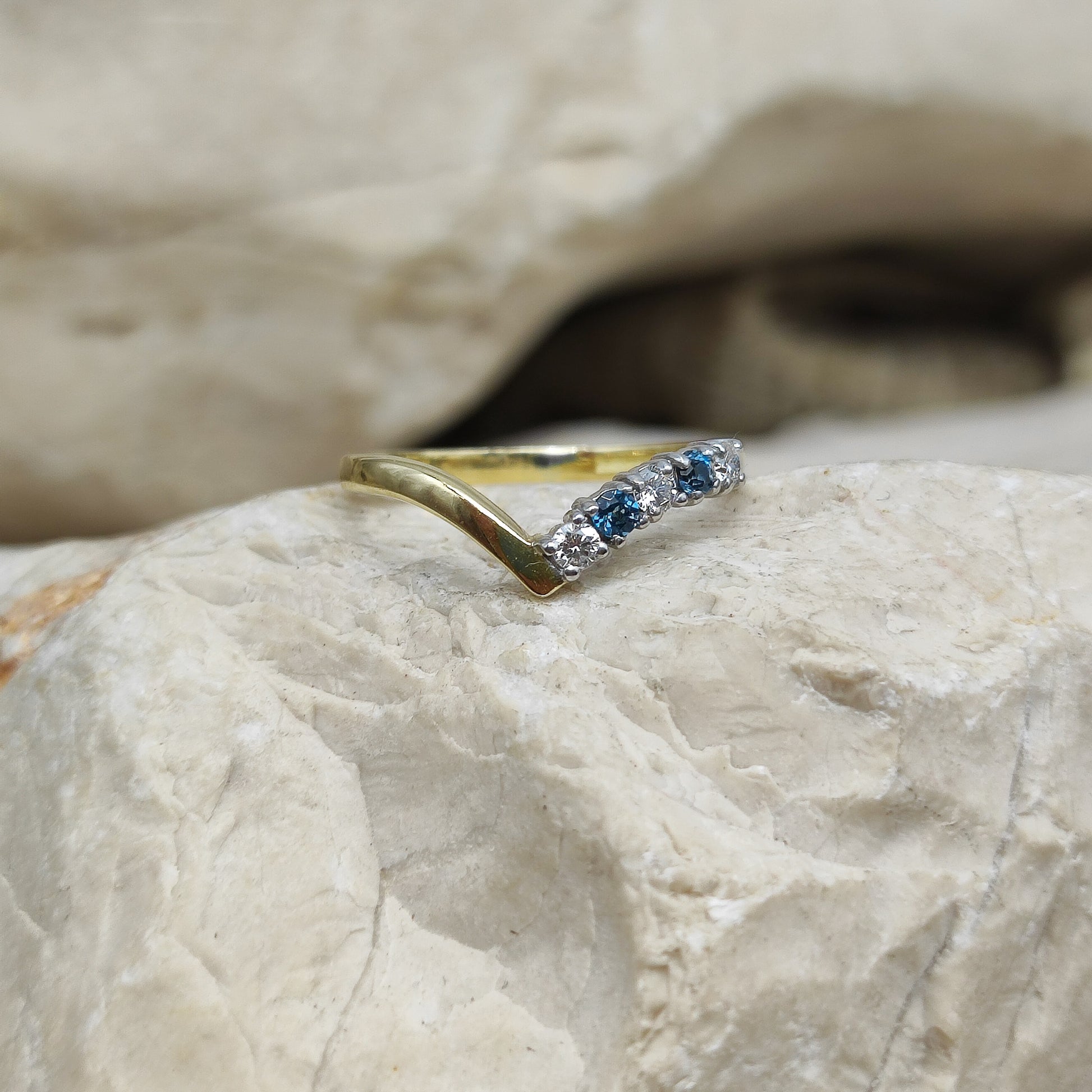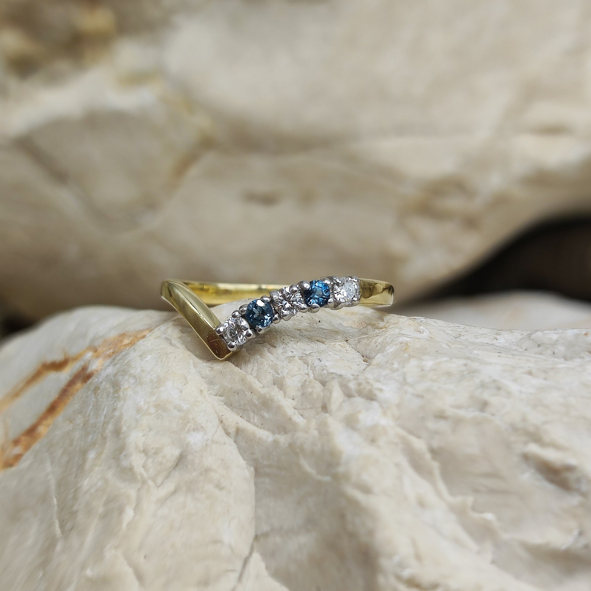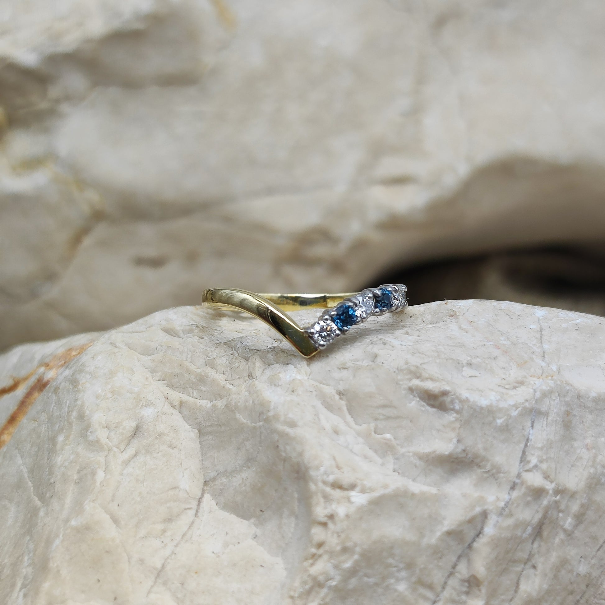 De ring heeft een wishbone model, een V vorm dus met aan de ene kant een rij edelstenen.  De edelstenen zijn gezet in wit goud en zijn afwisselend diamant en London Blue Topaz.