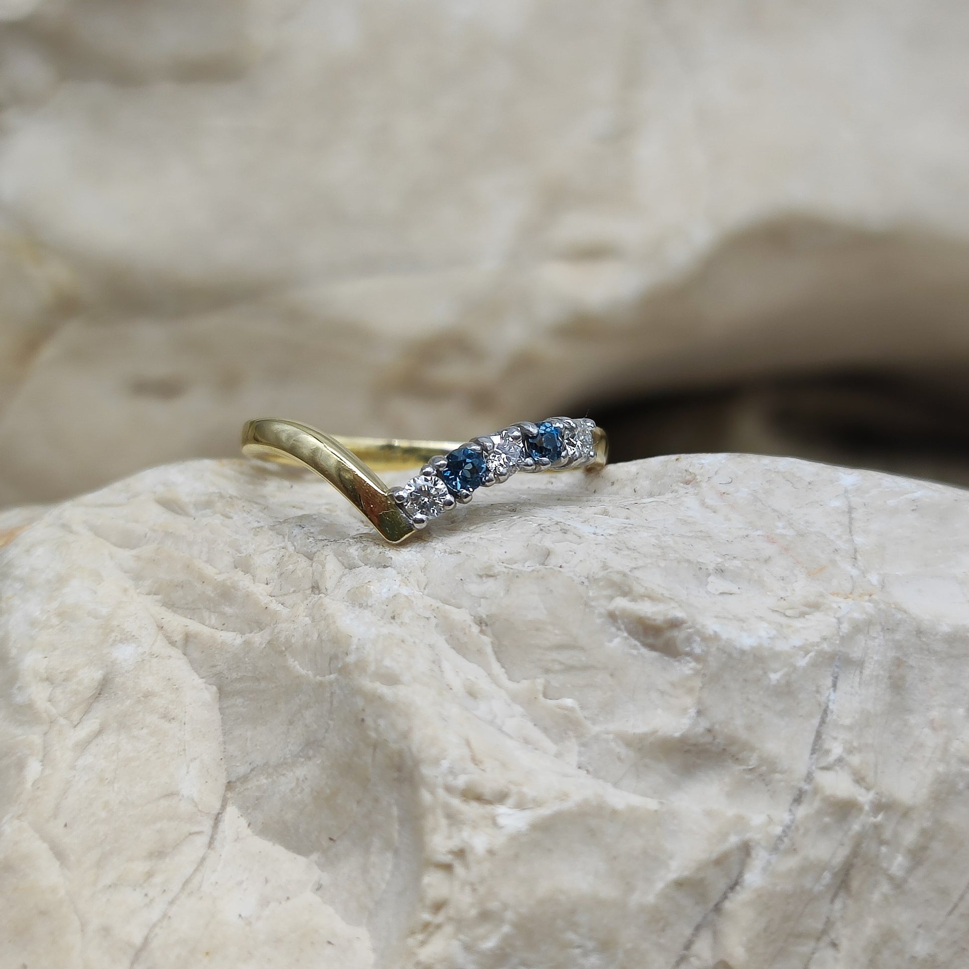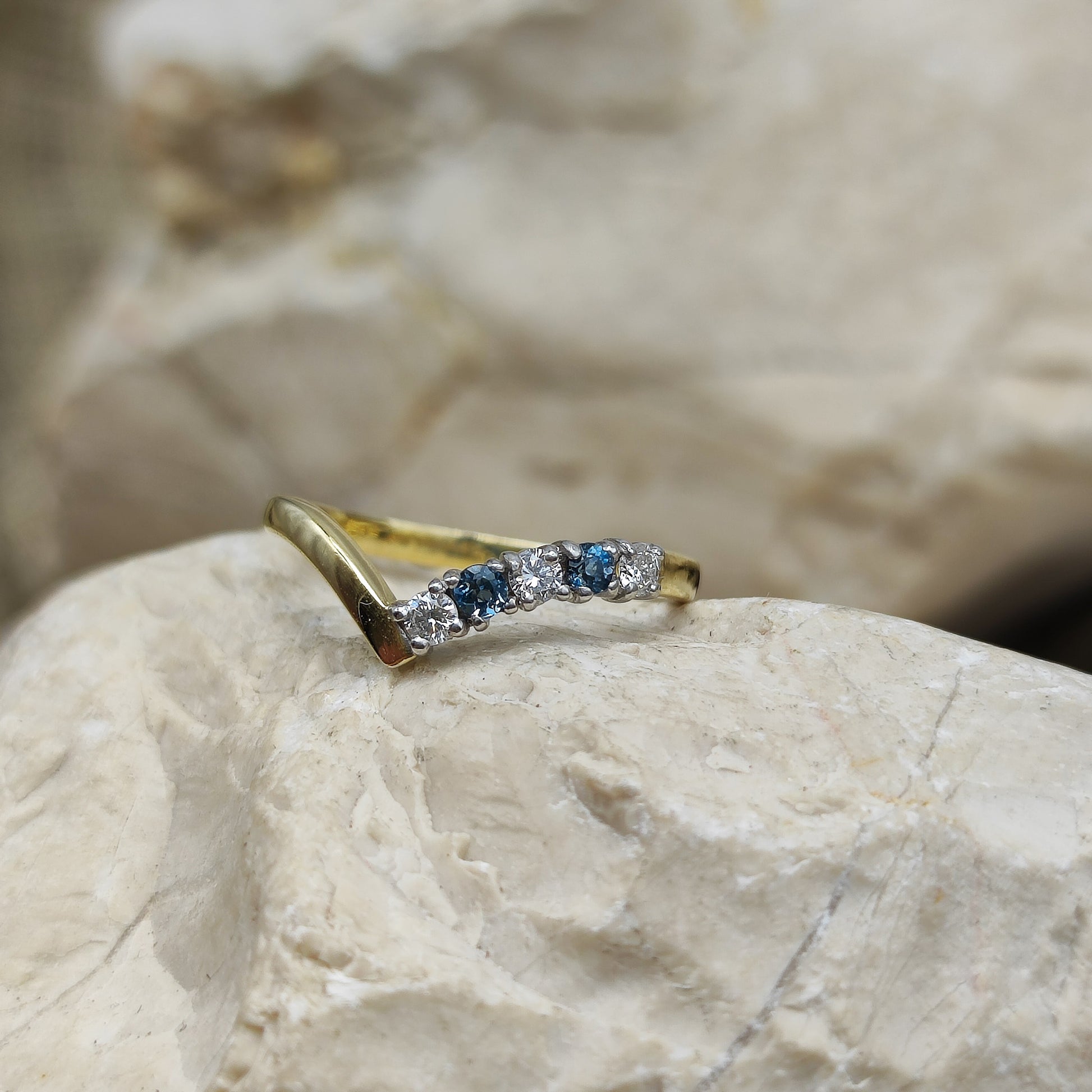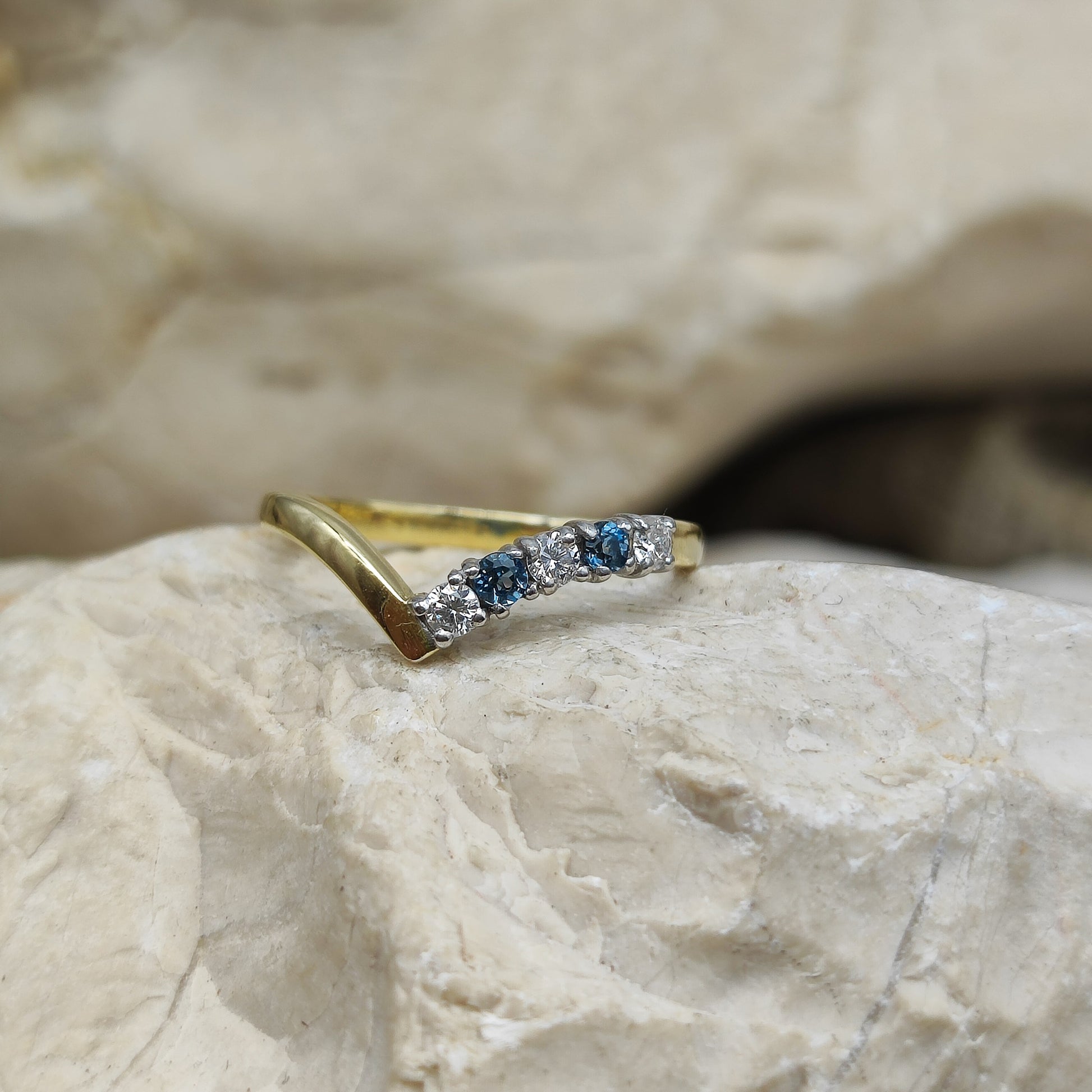 Vintage diamond and London Blue Topaz wishbone ring in 18K gold