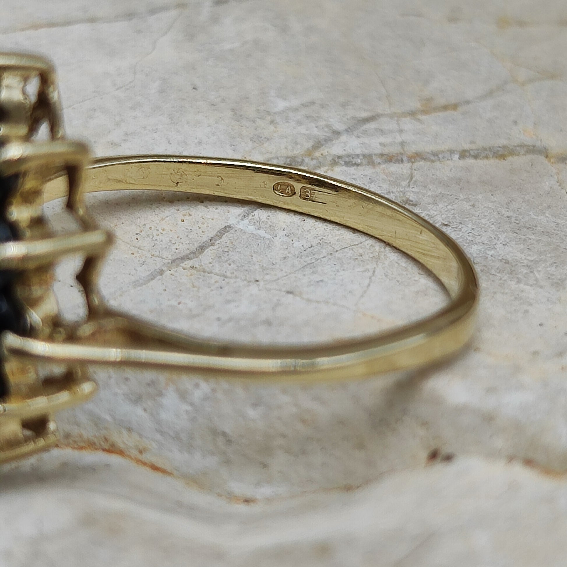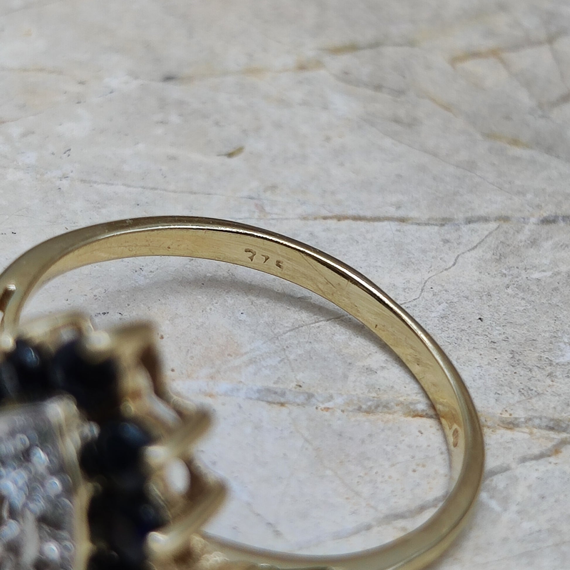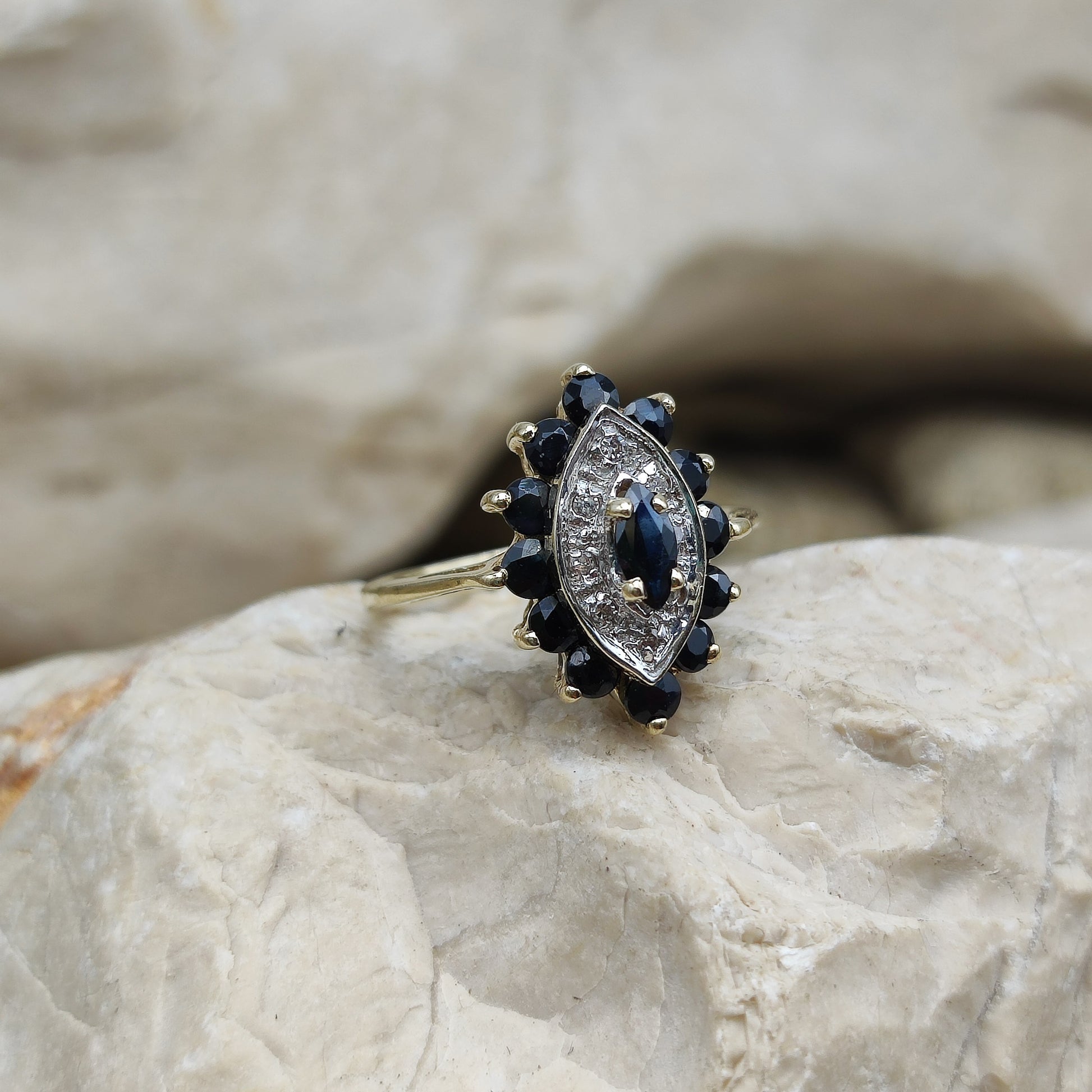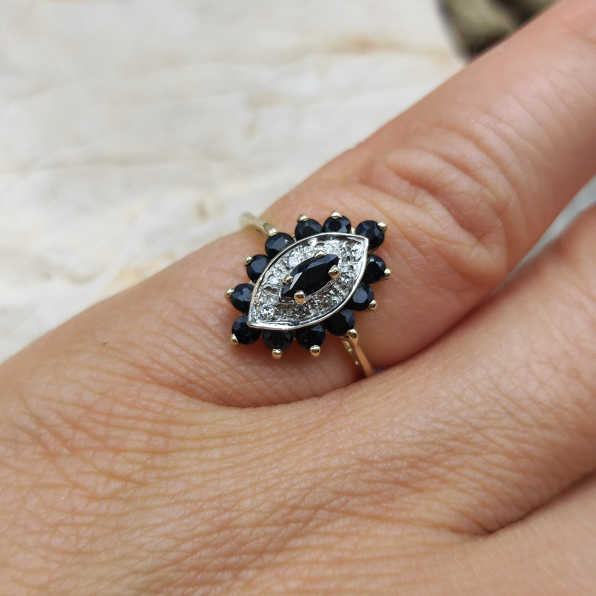 Prachtige Navette ring met saffier en diamant in 9 Karaat goud.