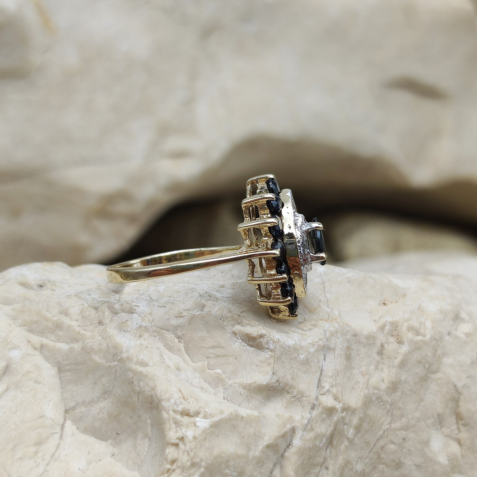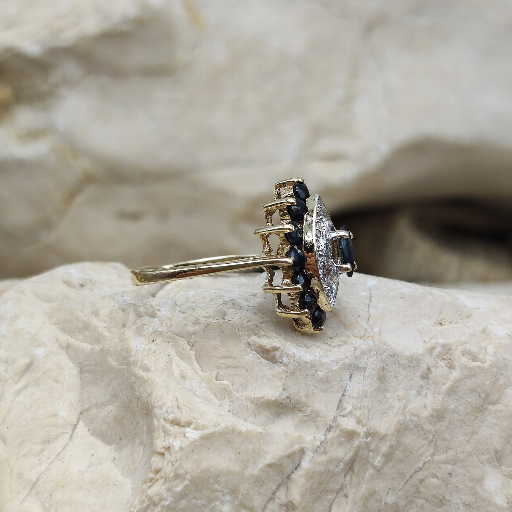 De ring heeft in het midden een markies geslepen saffier met een entourage van 8 diamanten en nog een buitenste rij saffieren.