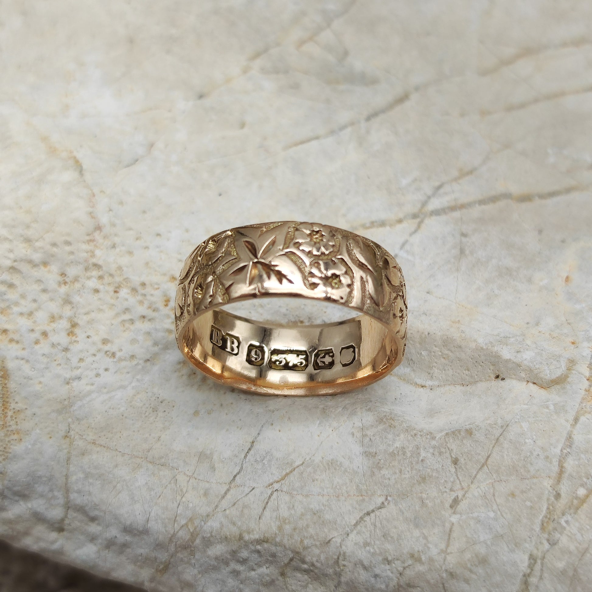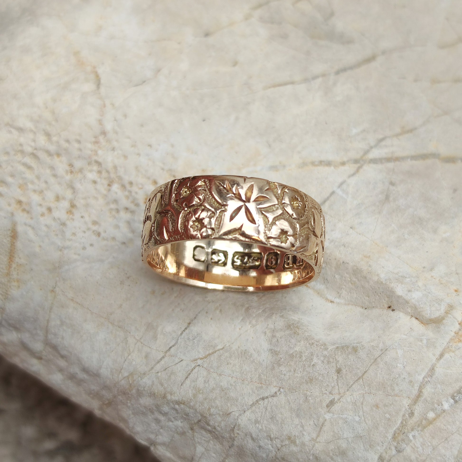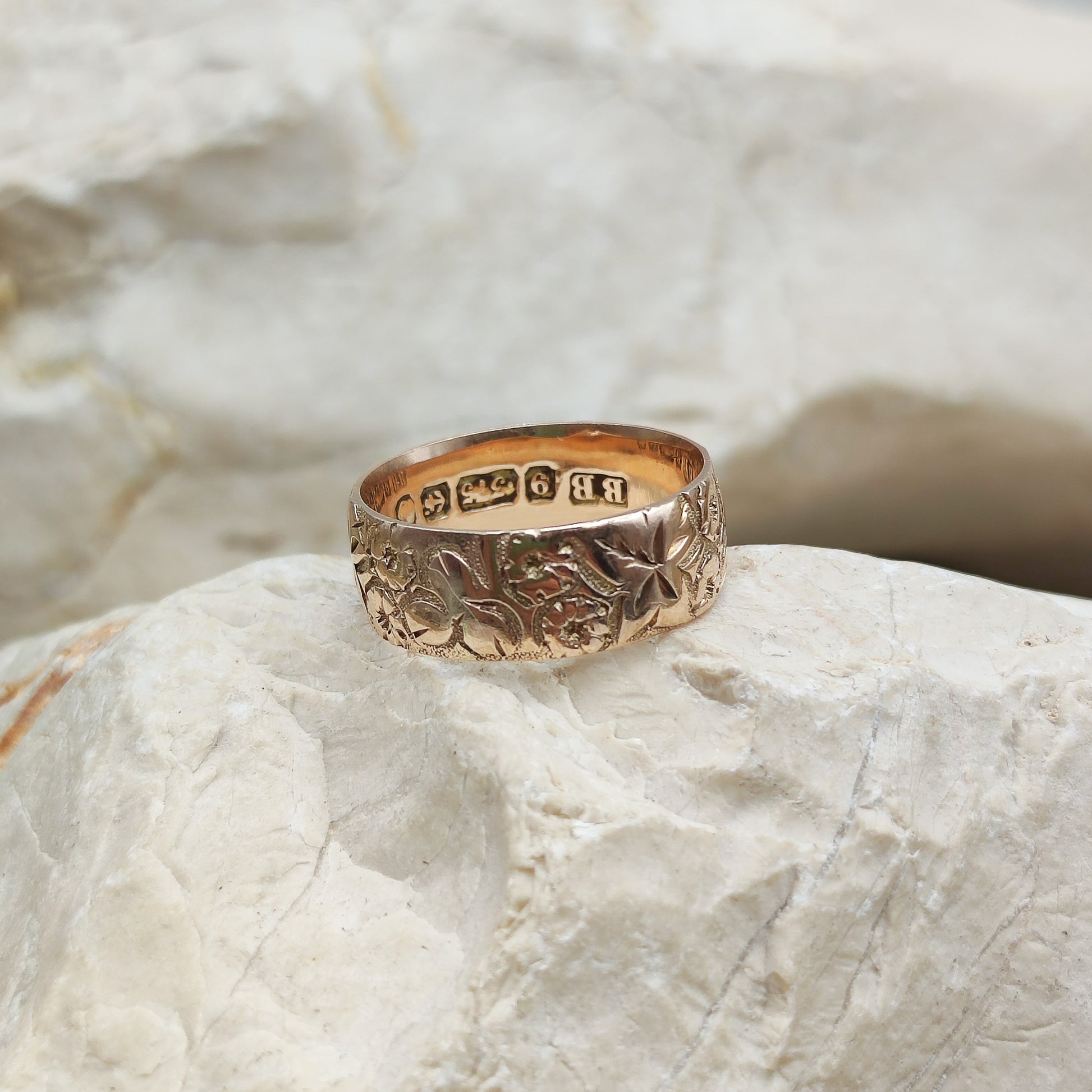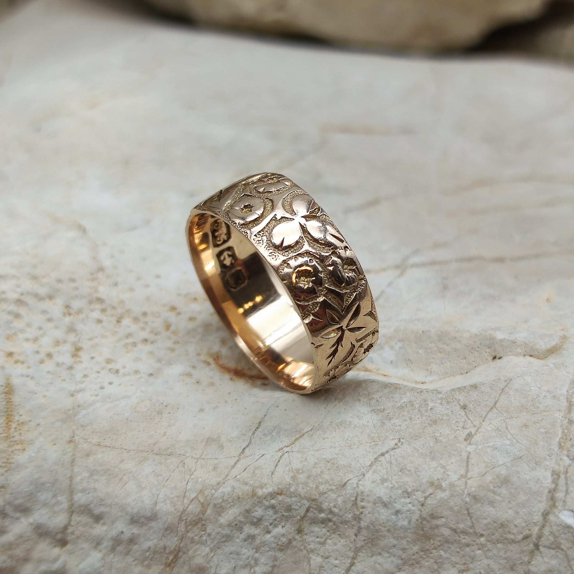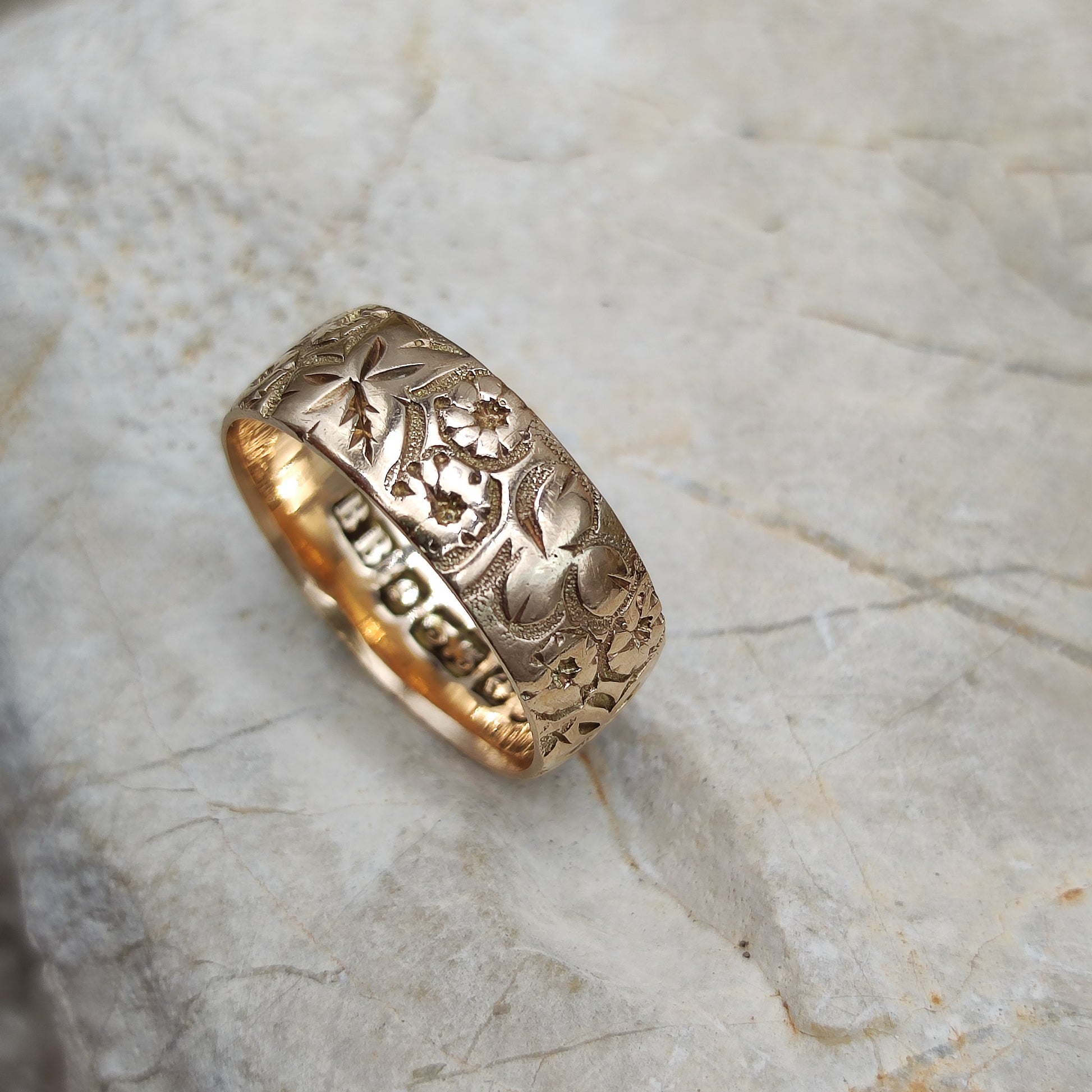 Deze ring is een typische "cigar band" ring met klimop ranken en een bloemetjespatroon. Dit patroon zie vooral terug bij Victoriaanse sieraden maar ook nu kom je dit patroon tegen.