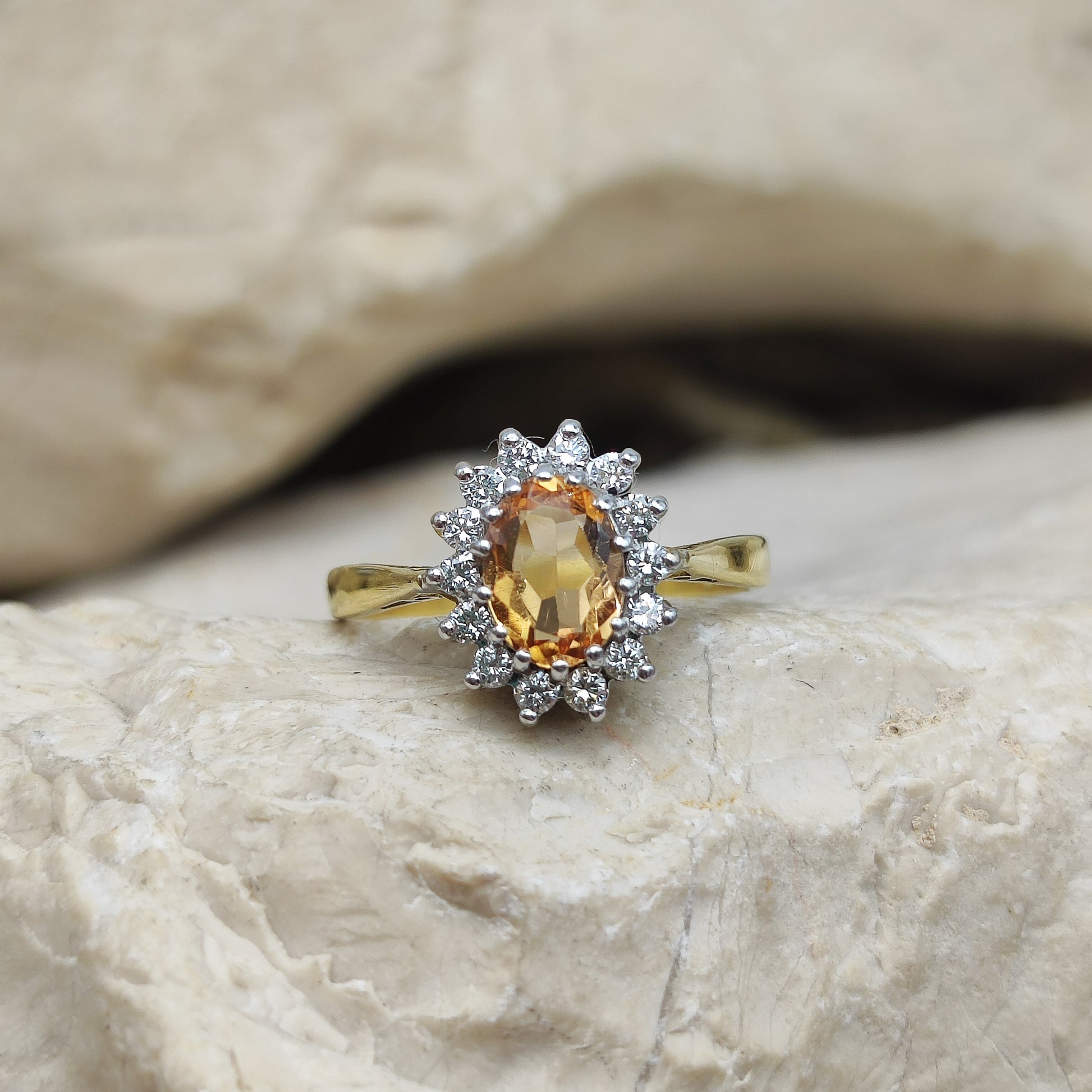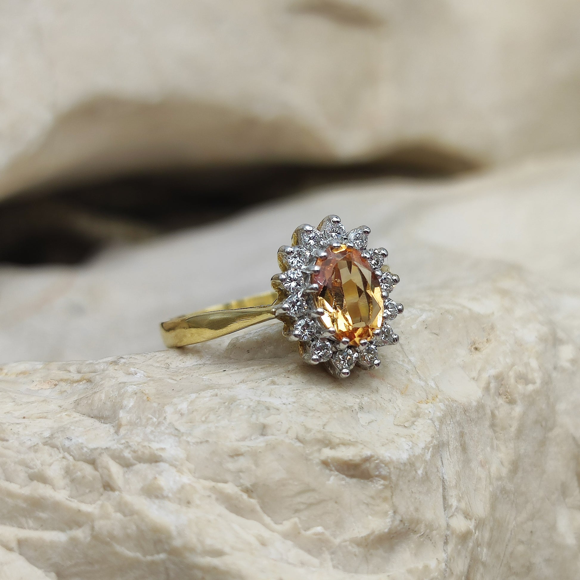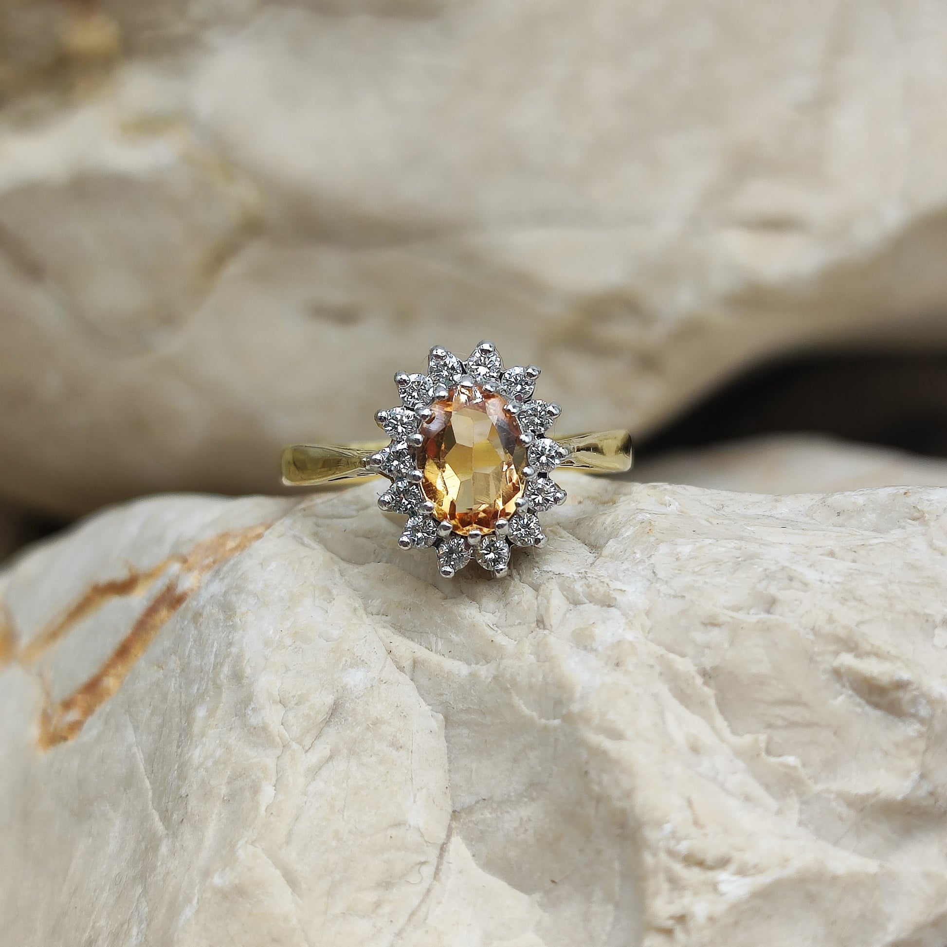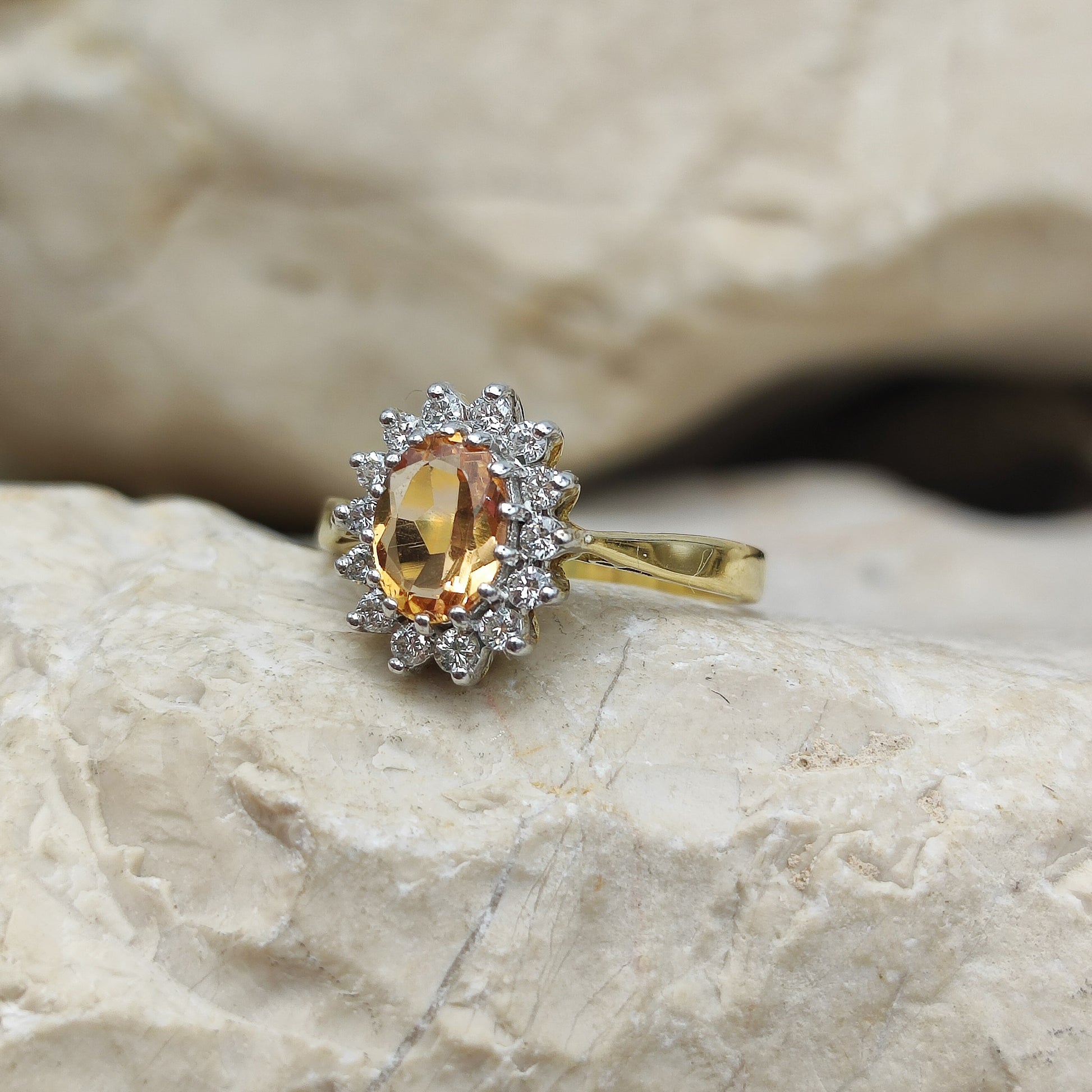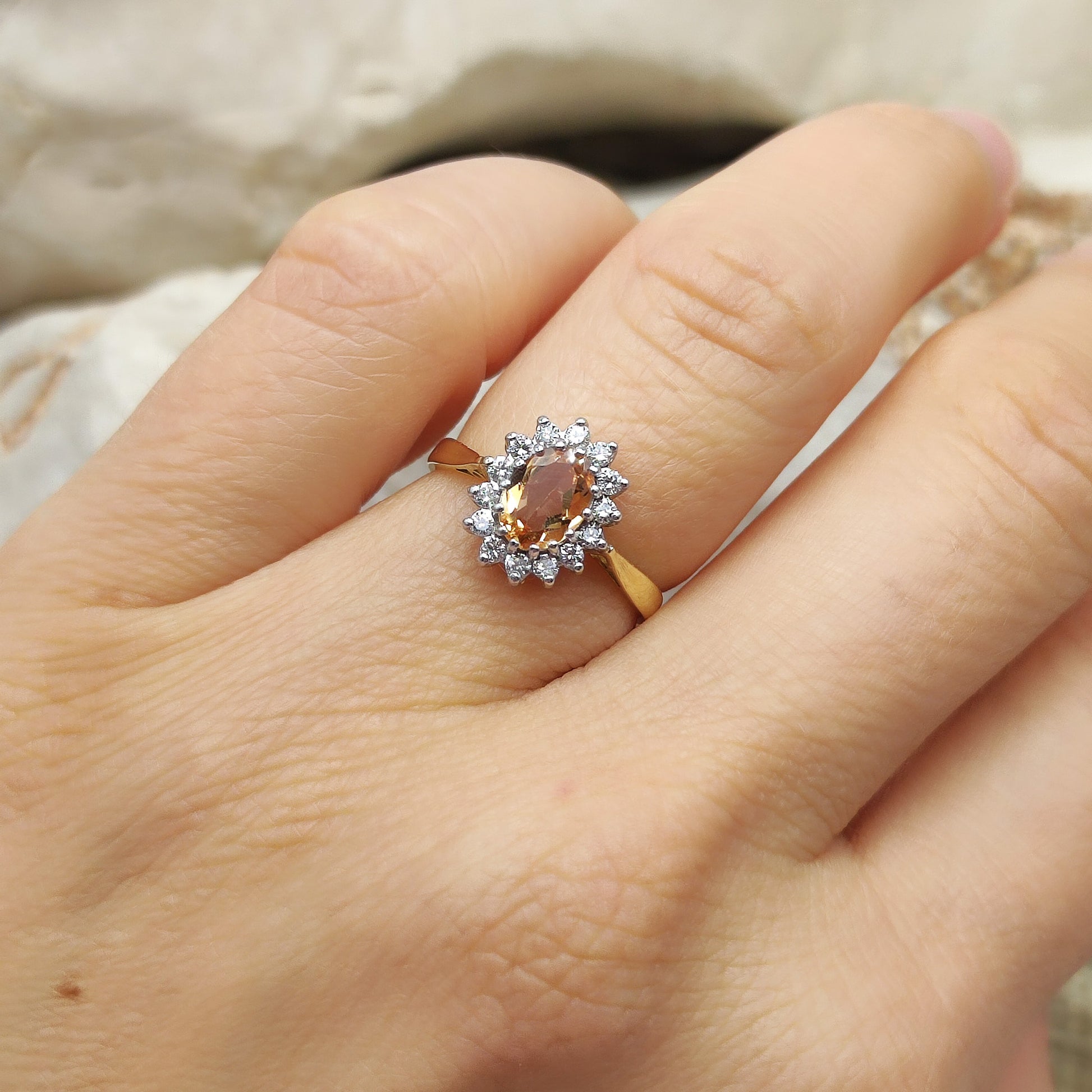 Prachtige ring met een ovale Spinel en een entourage van diamantjes in 18 Karaat goud.