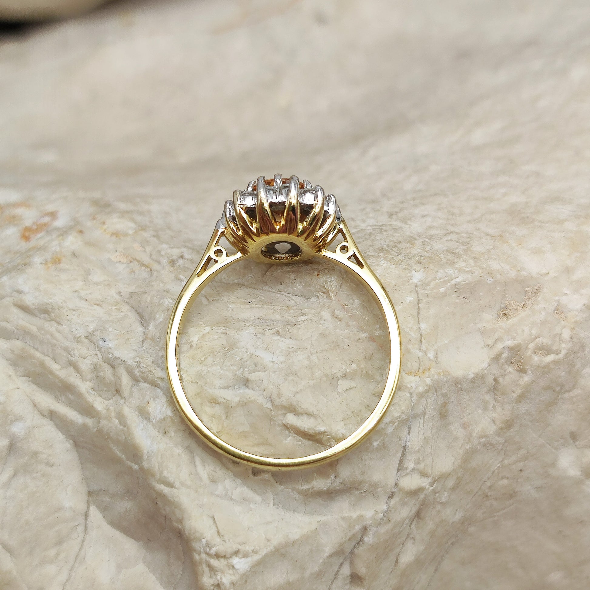 De ring heeft in het midden een ovale Spinel die vast zit met veel griffen. Daar rond een entourage in wit goud met diamantjes.
