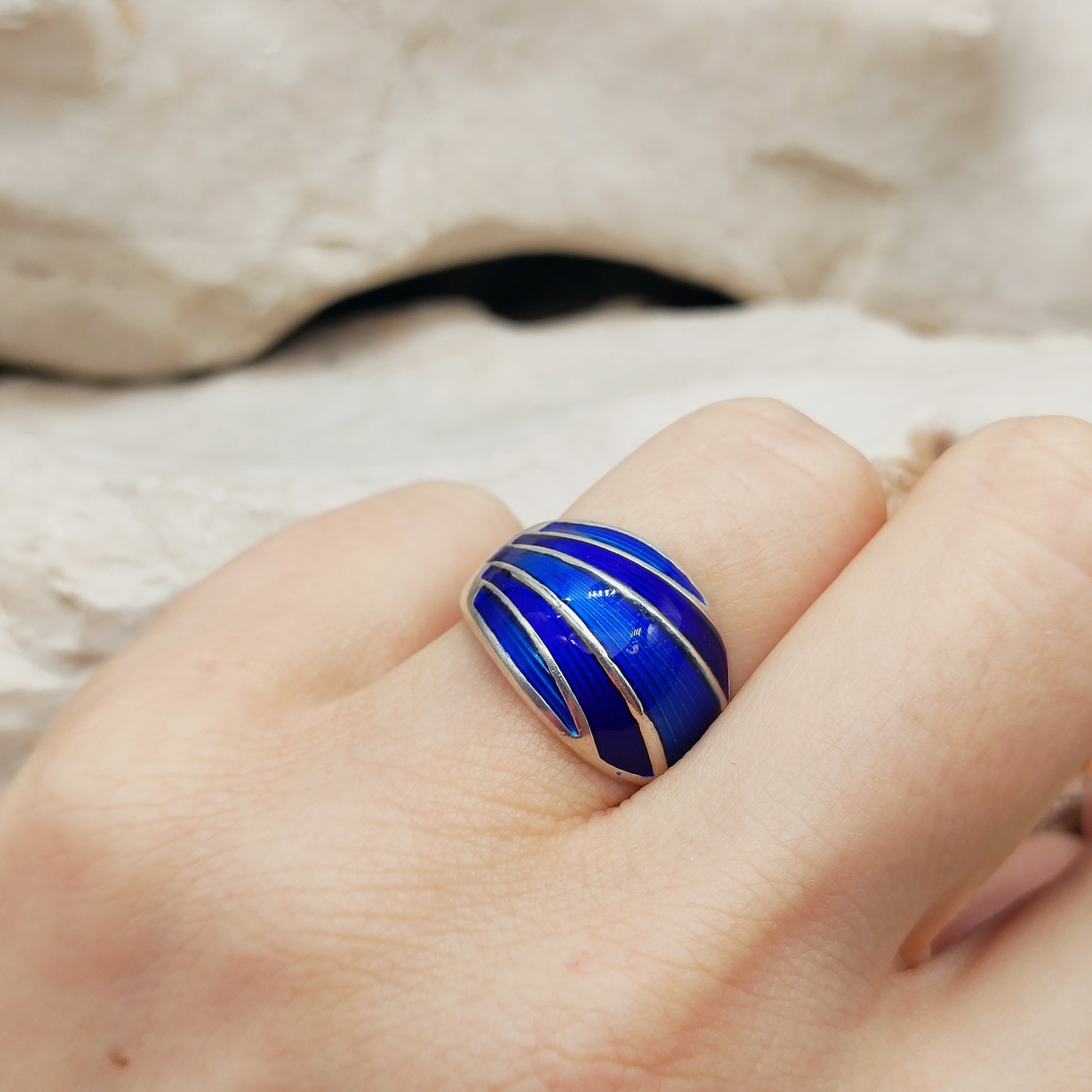 De bolle bovenkant loopt zacht rond af en is afgewerkt met blauw email in twee tinten: een diepe kobaltblauwe basis met lichtere blauwe accenten. Het email ligt in een gestreept patroon binnen het zilveren kader.