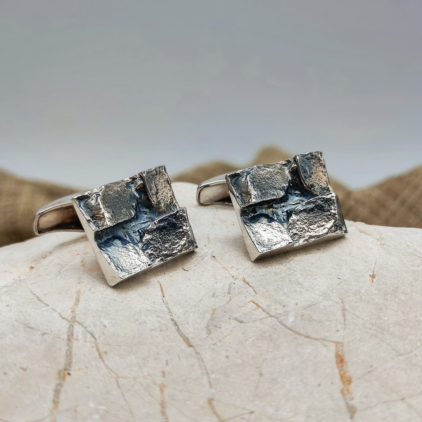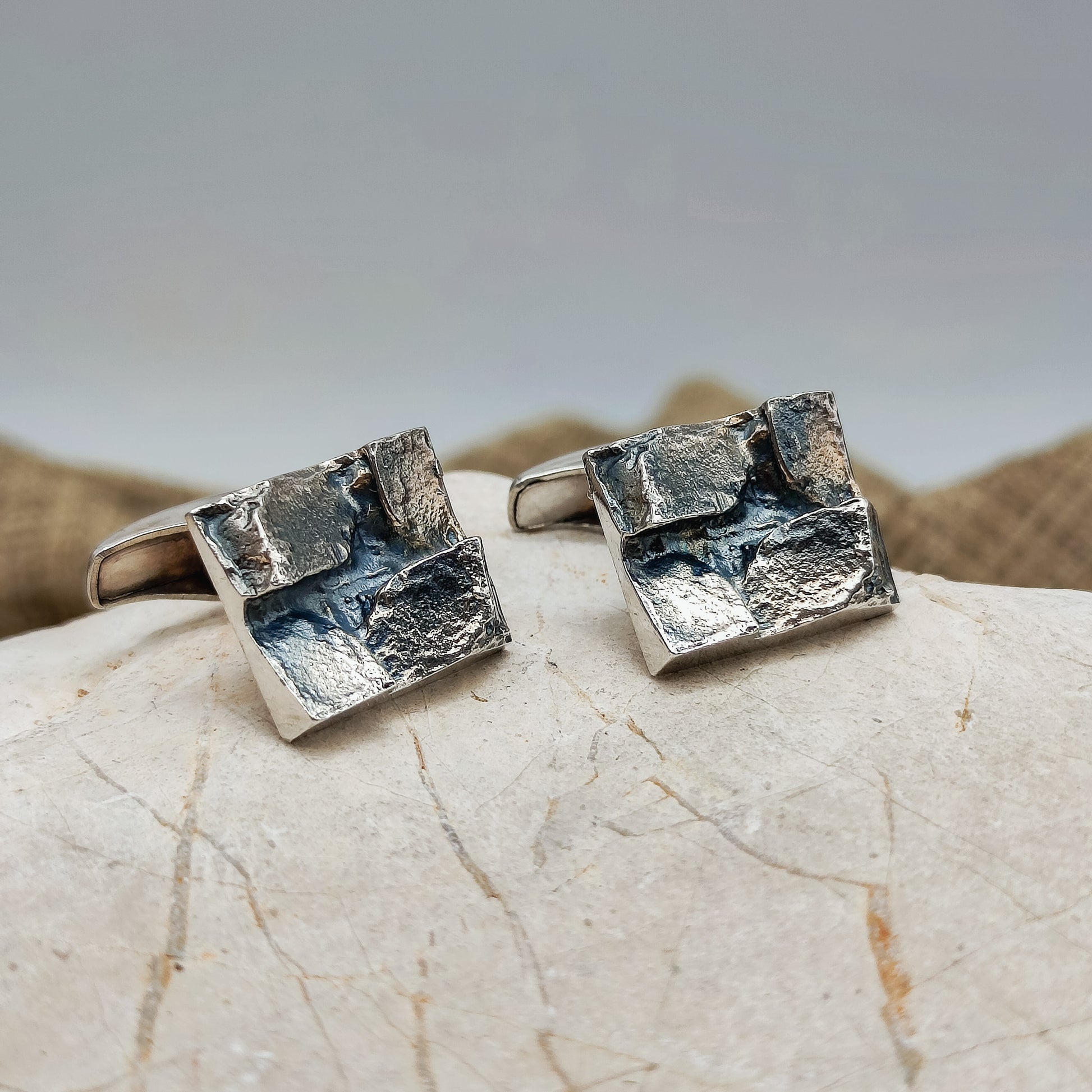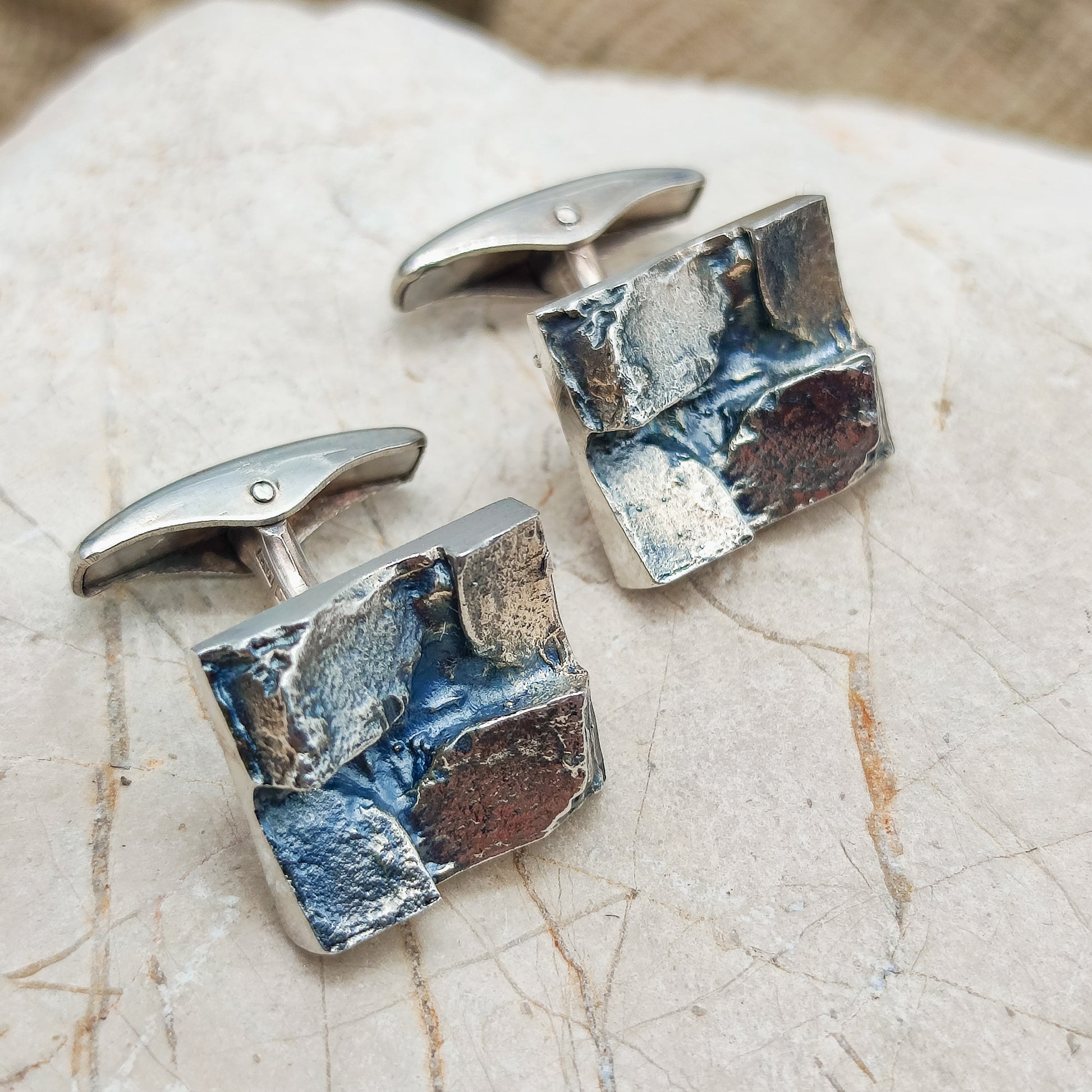 De voorkant van de manchetknopen zijn rechthoekig met 4 brute geometrische delen erbovenop.  De afwerking van deze manchetknopen zijn wat donkerder, wellicht gebeitst.