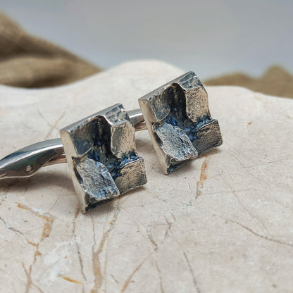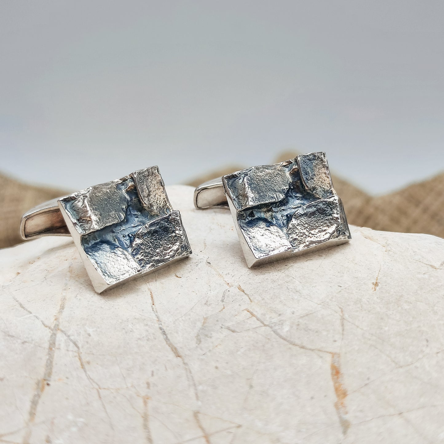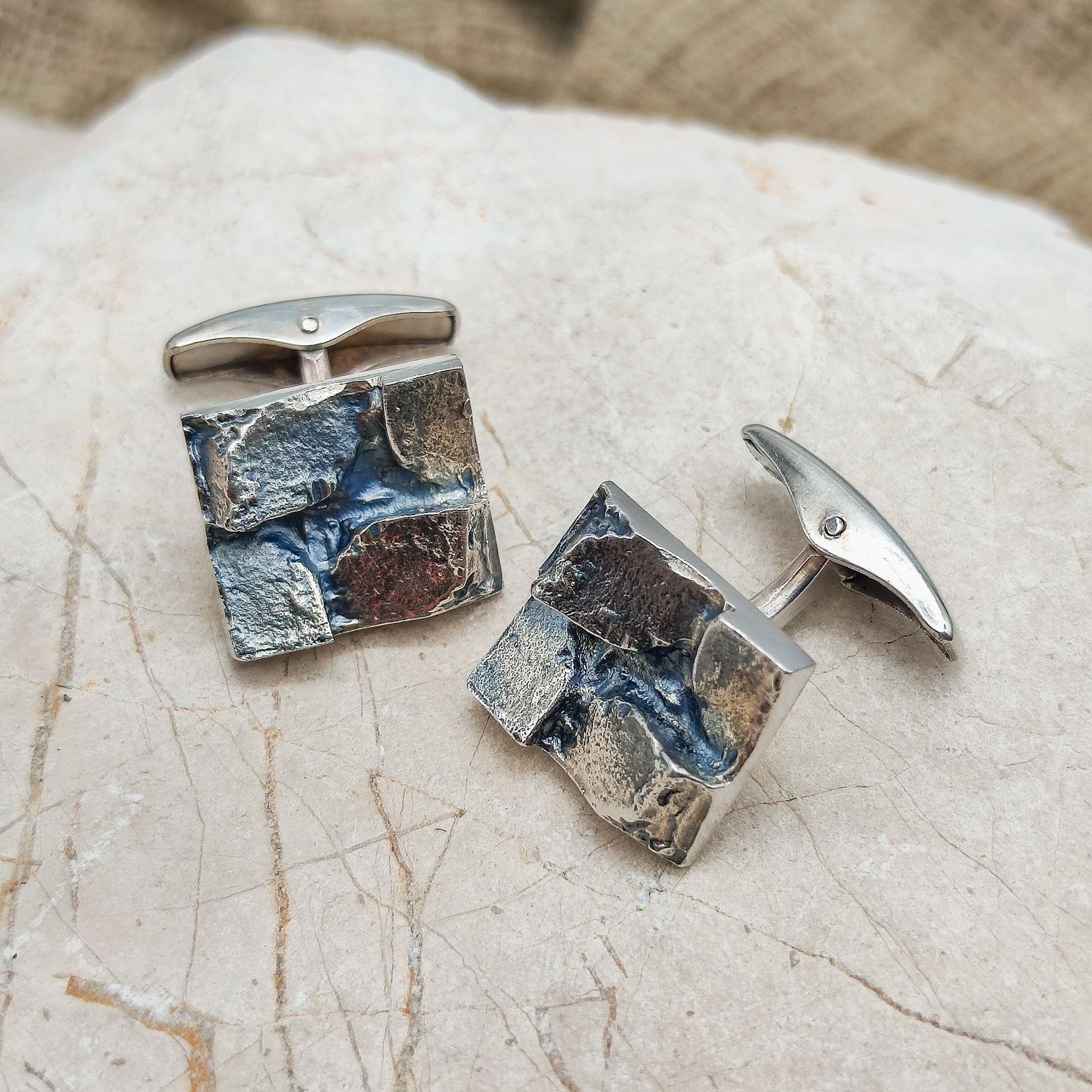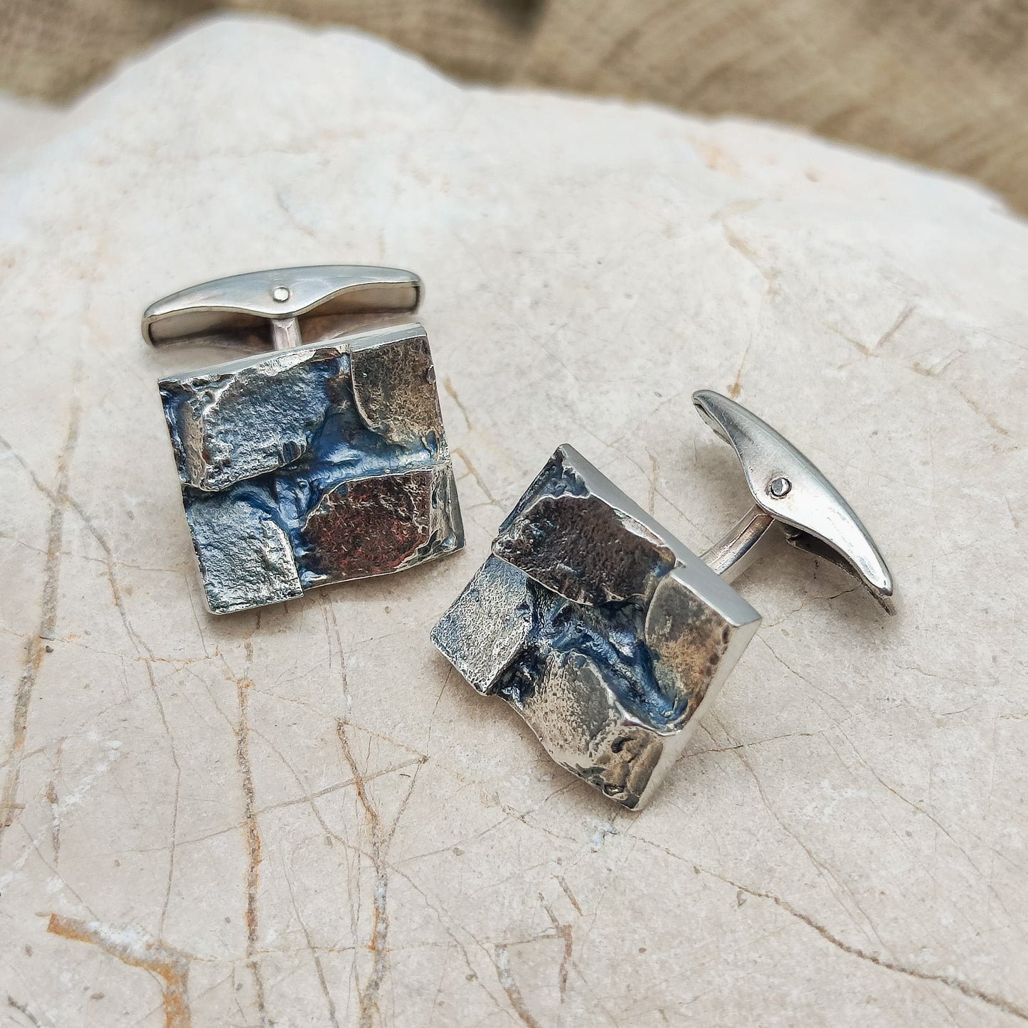 De voorkant van de manchetknopen zijn rechthoekig met 4 brute geometrische delen erbovenop.  De afwerking van deze manchetknopen zijn wat donkerder, wellicht gebeitst.