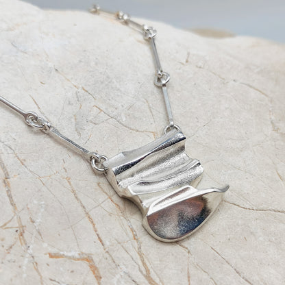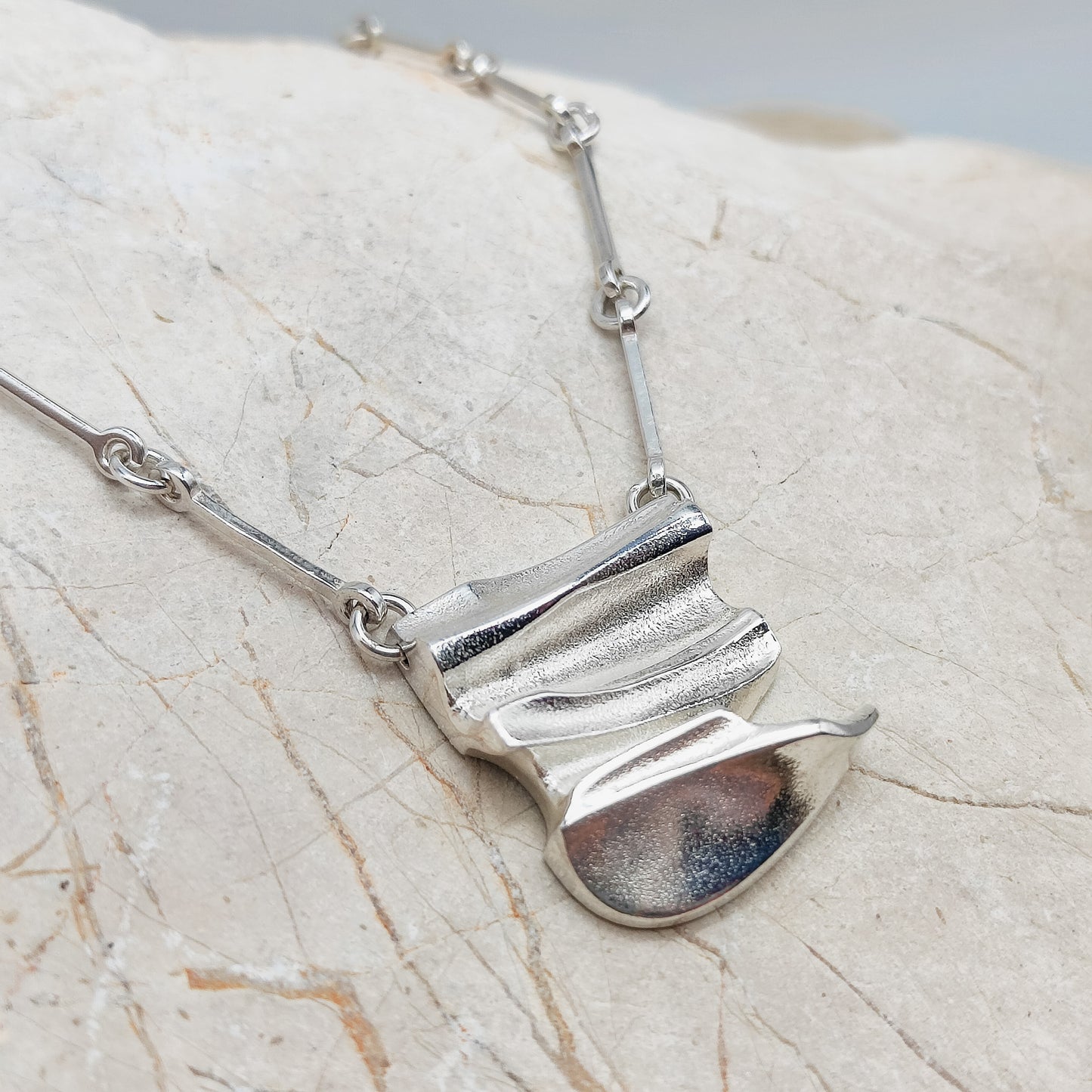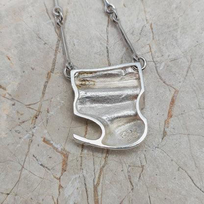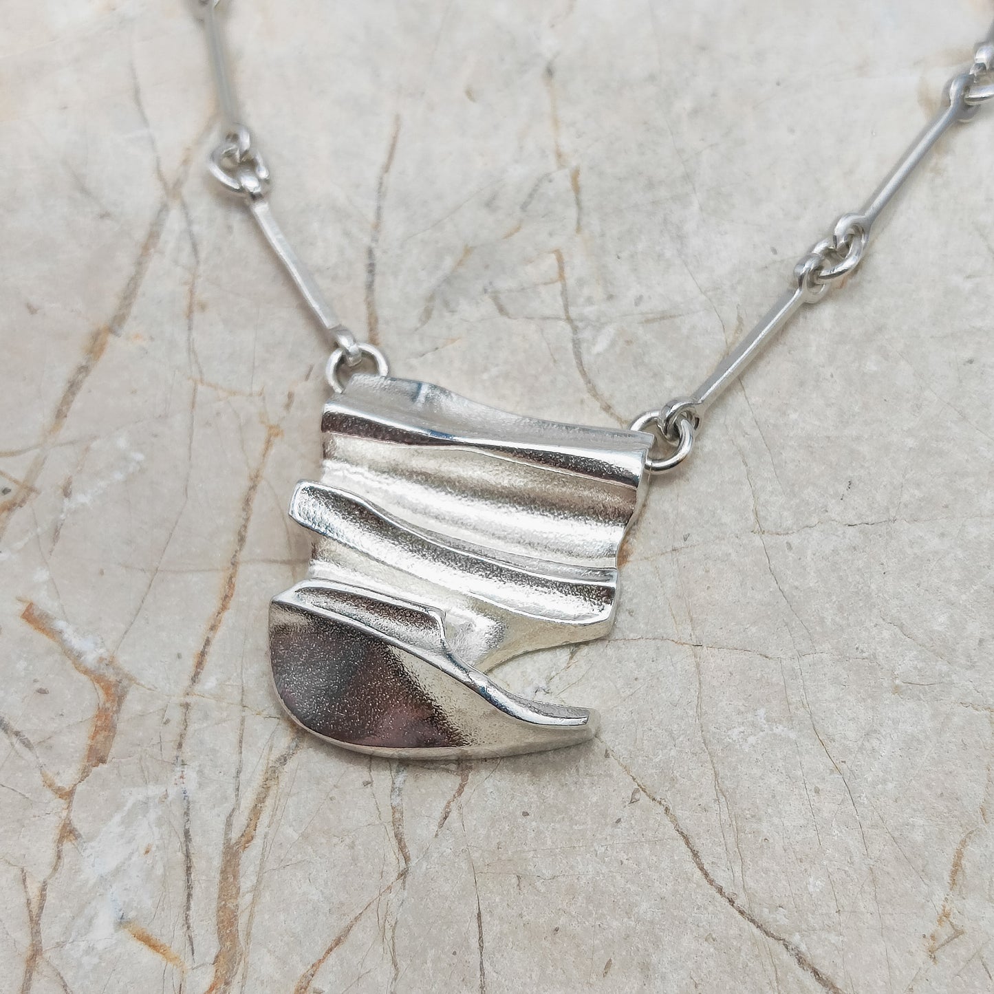De afwerking van de hanger is mat met een lichte structuur en de ketting is gemaakt in hoogglans en sluit met een haaksluiting.