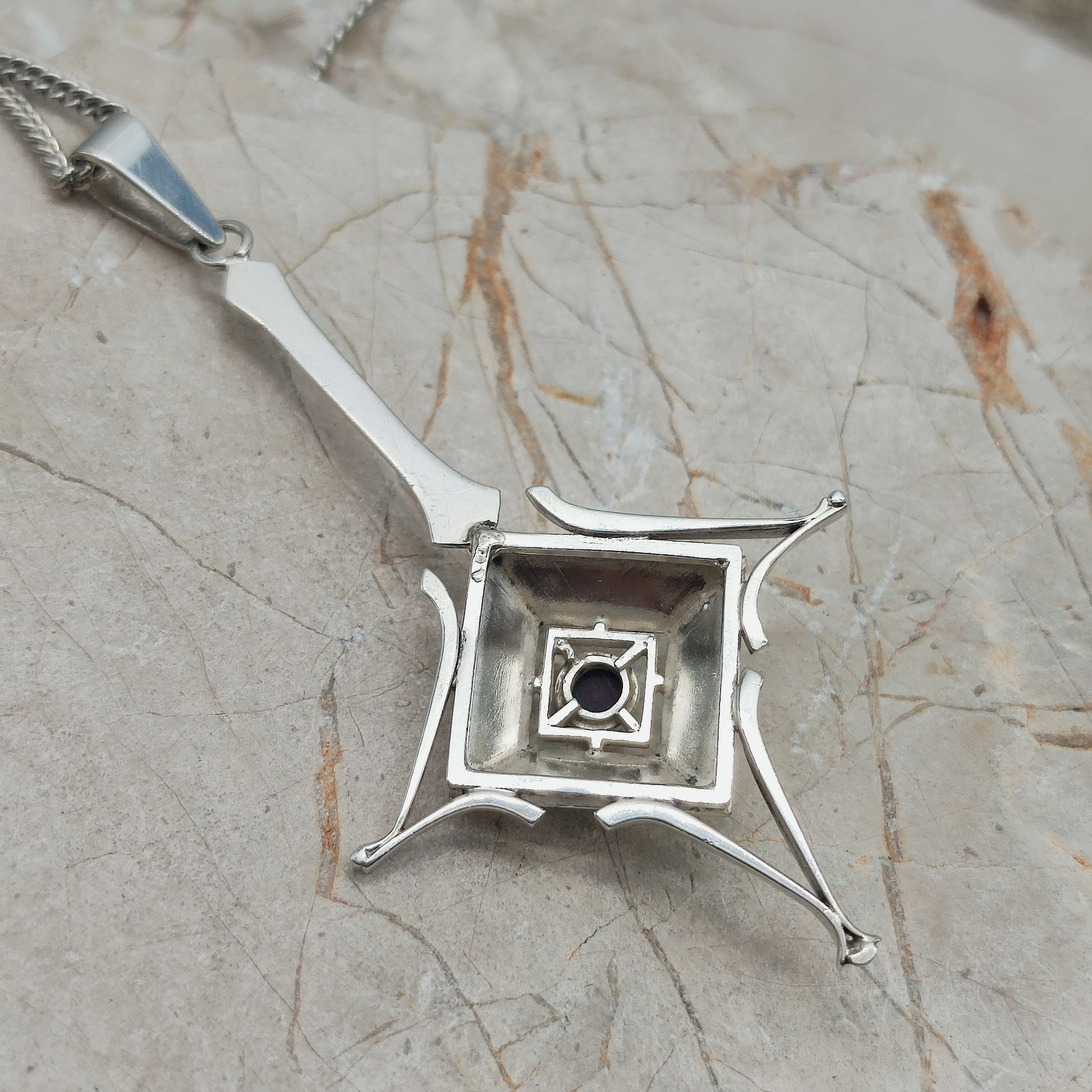 Deze zilveren hanger is opgebouwd rond een strak, geometrisch ontwerp met duidelijke verwijzingen naar de Art Deco. Het centrale element is een vierkant volume met een gefacetteerde granaat in een gesloten zetkast, omgeven door scherpe lijnen en gelaagde vlakken.