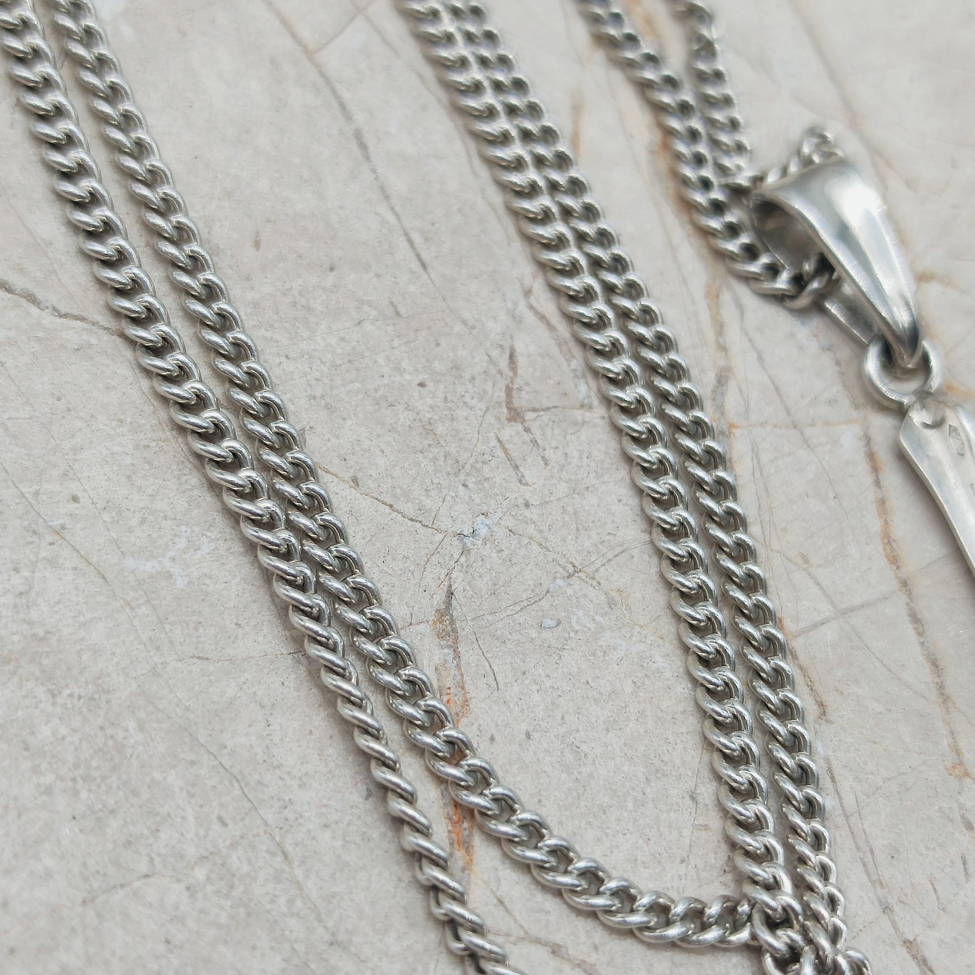 De hanger wordt gedragen aan een stevige zilveren schakelketting.