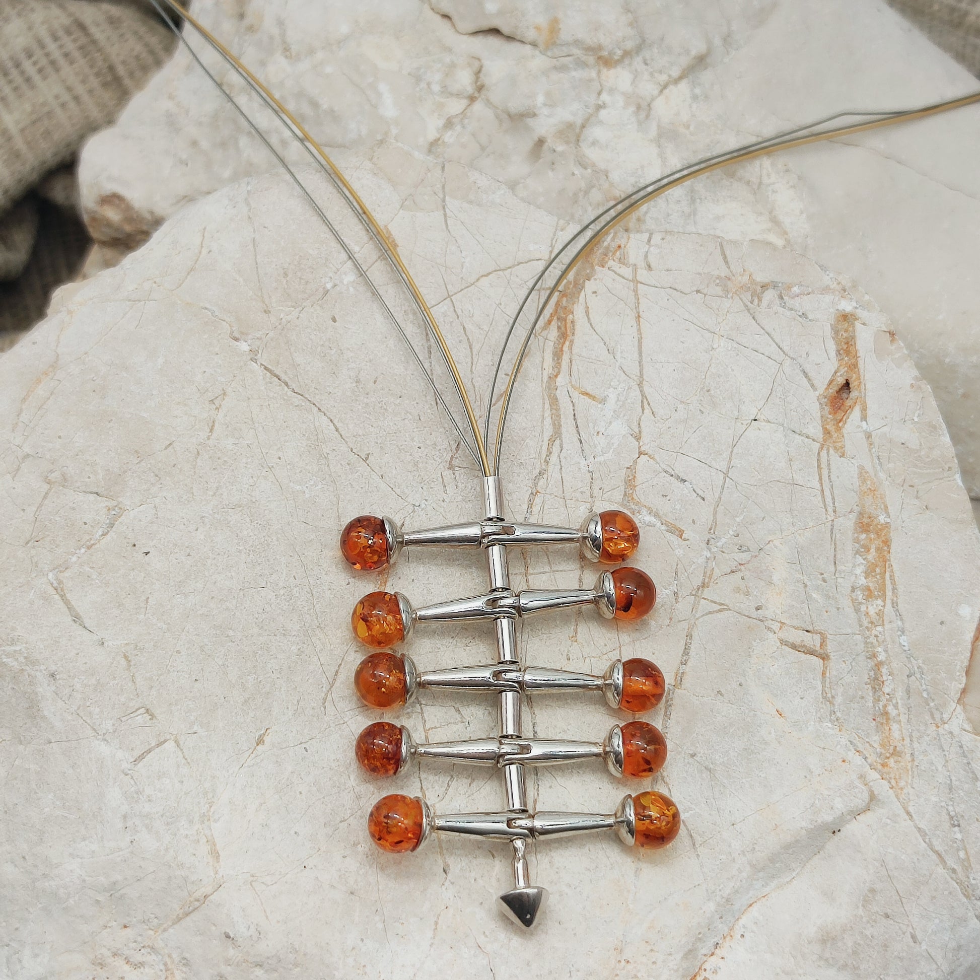 Modernist kinetic amber necklace 1970s silver