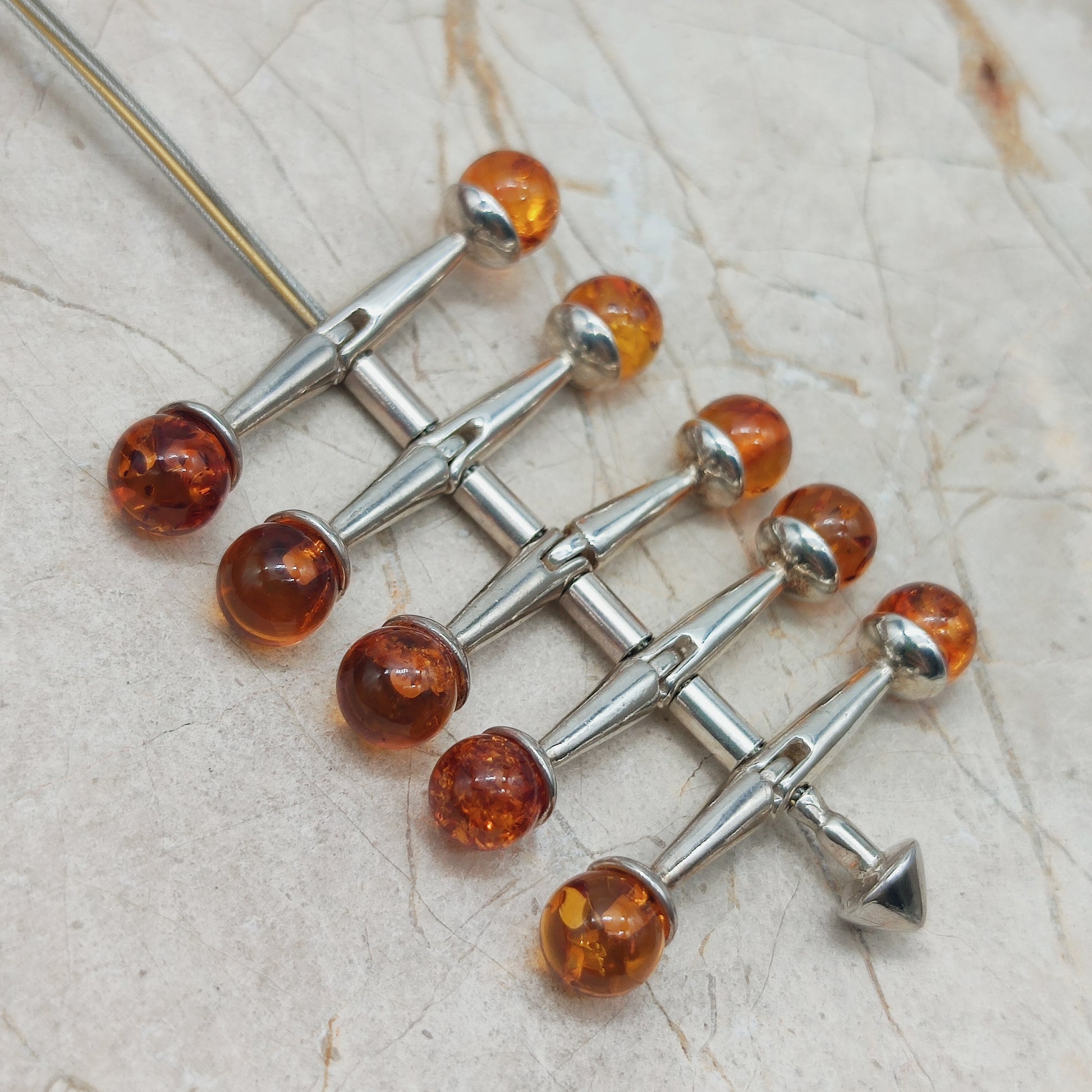 Deze modernistische kinetische ketting draait volledig rond beweging. De amber bolletjes zijn afzonderlijk gemonteerd en bewegen vrij rond de centrale constructie, waardoor de hanger telkens anders valt tijdens het dragen.