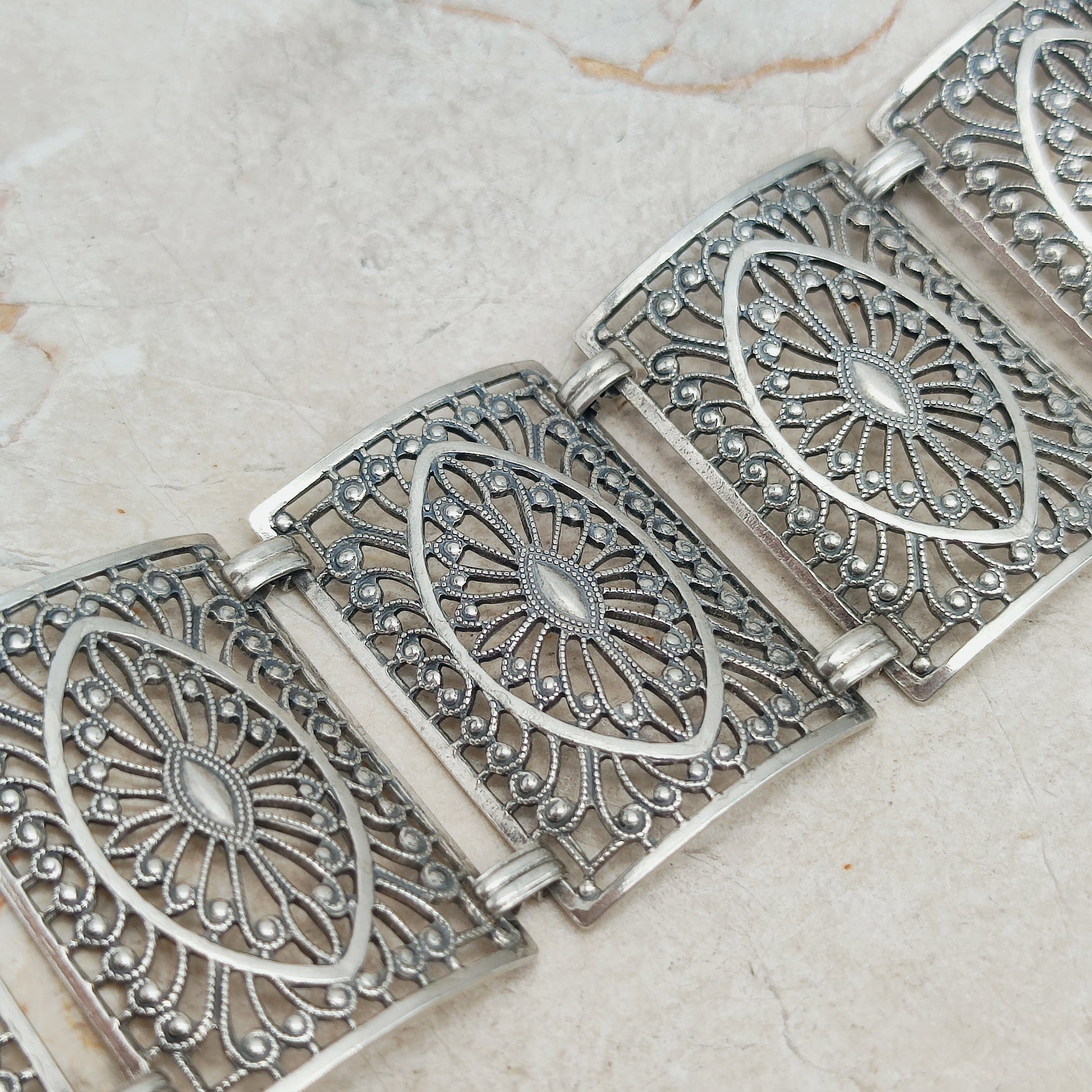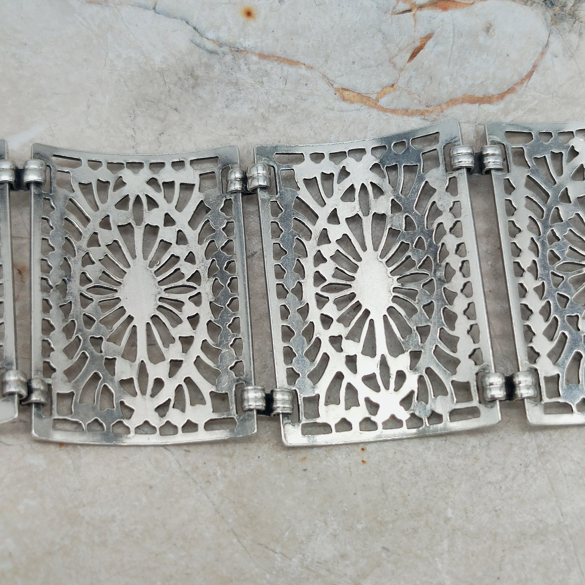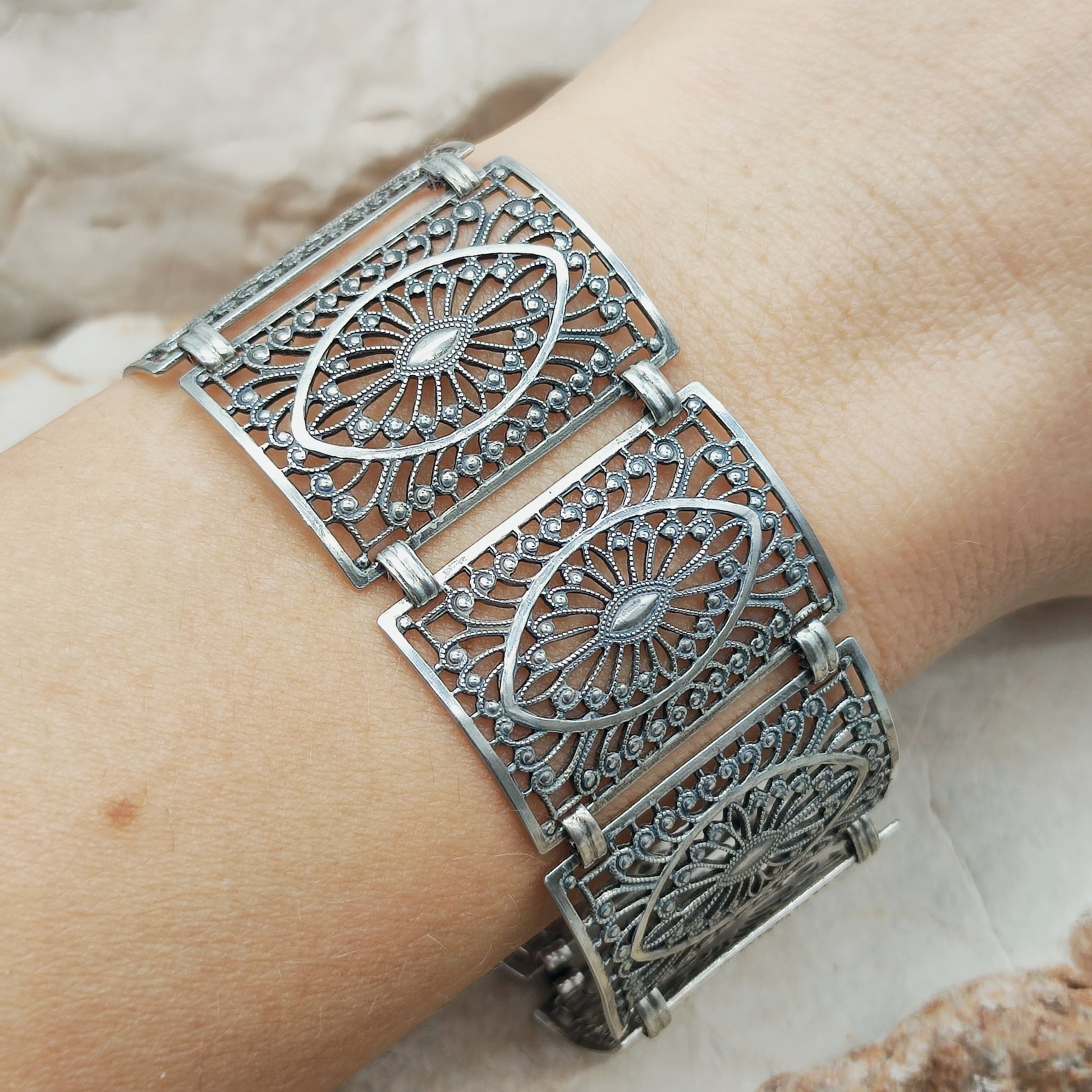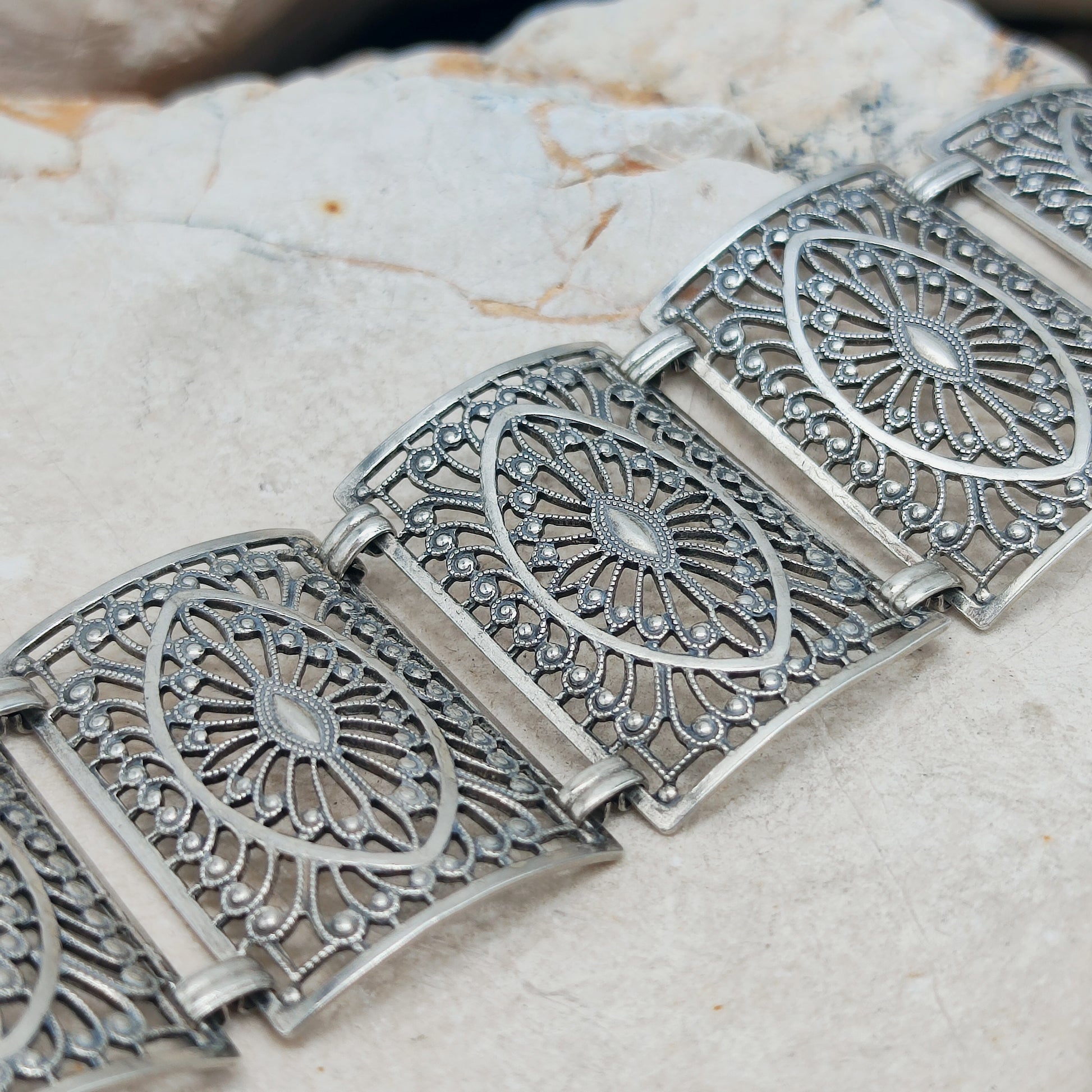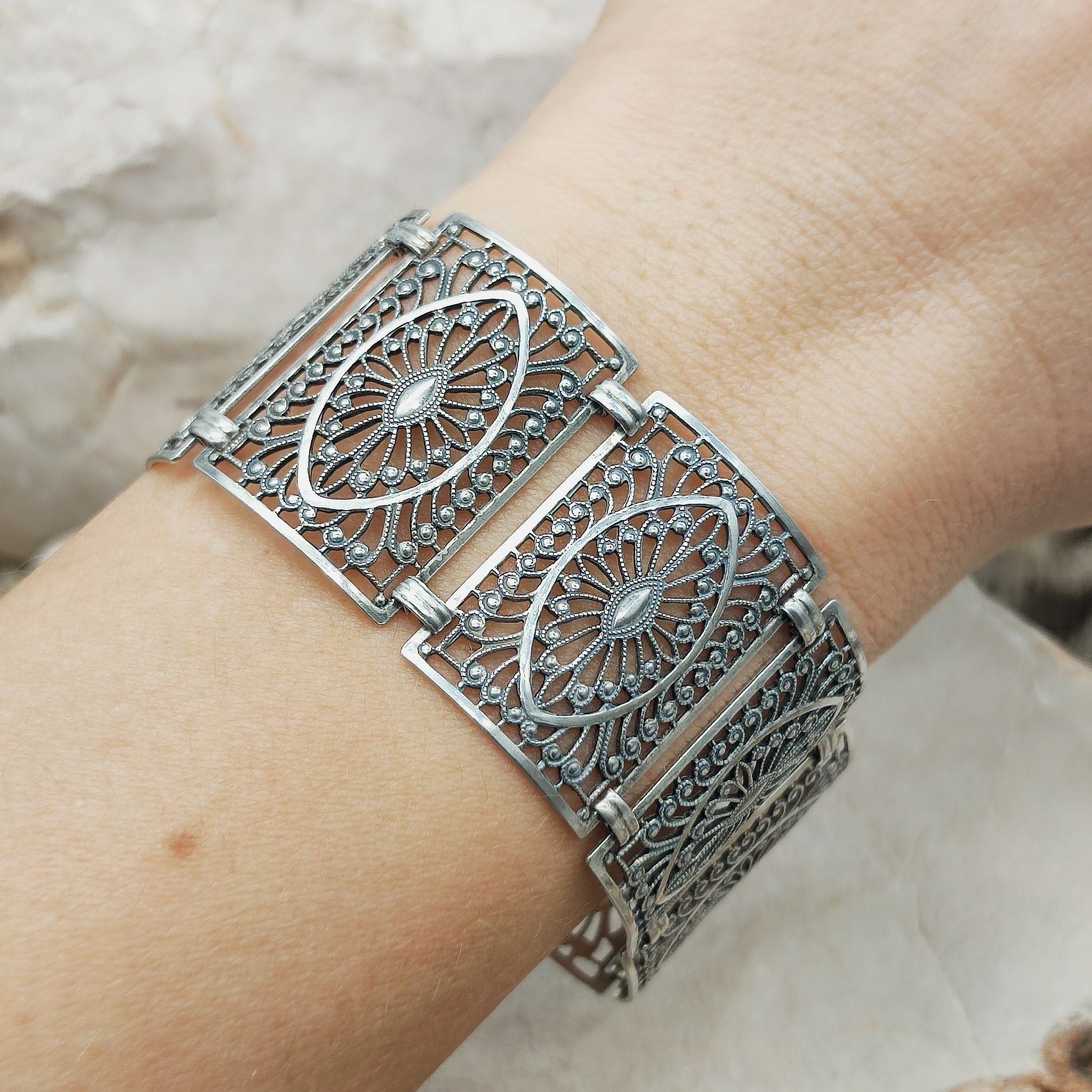 Acht opengewerkte panelen vormen samen een brede maar toch luchtige armband die mooi om de pols valt.
