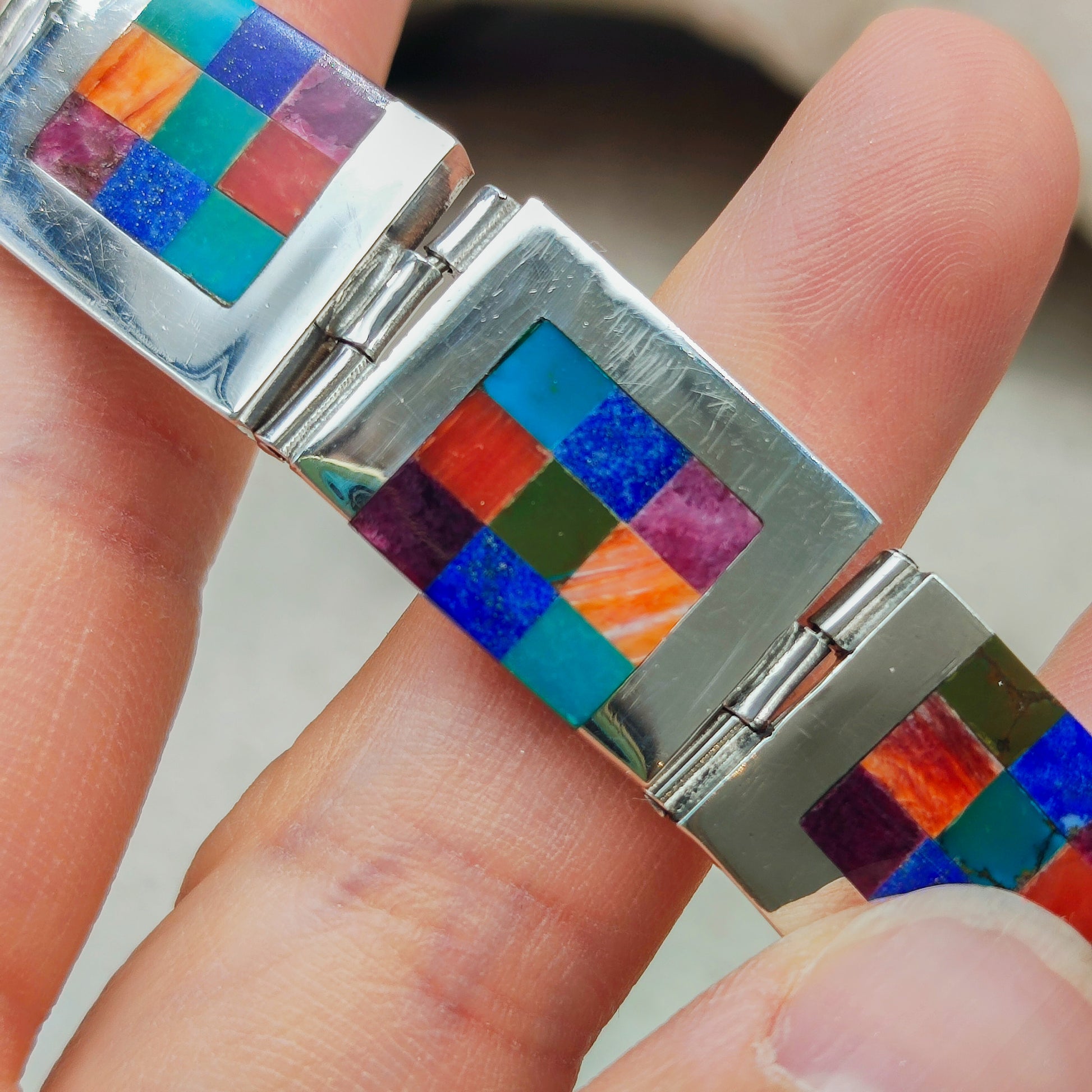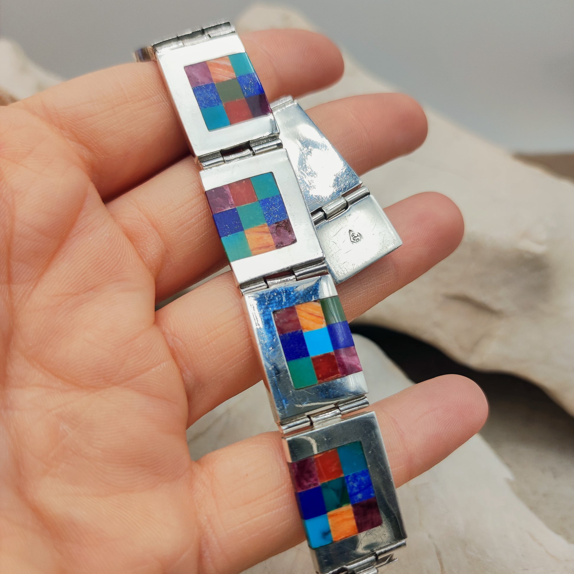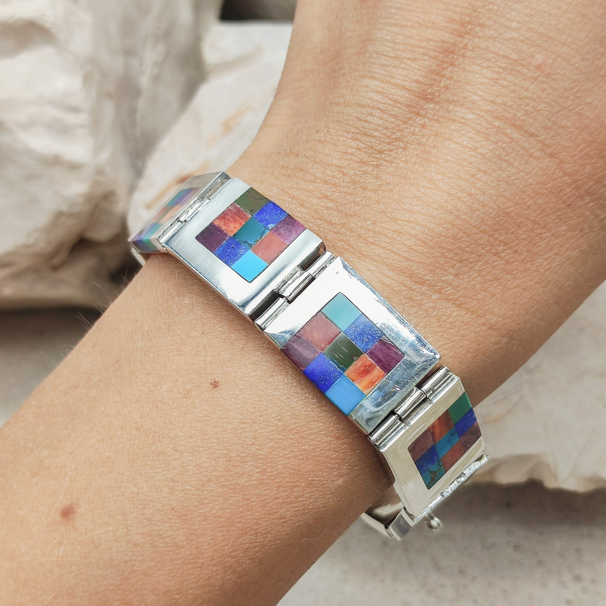Zeer kleurrijke vintage armband met ingelegde vierkantjes, gemaakt in zilver.