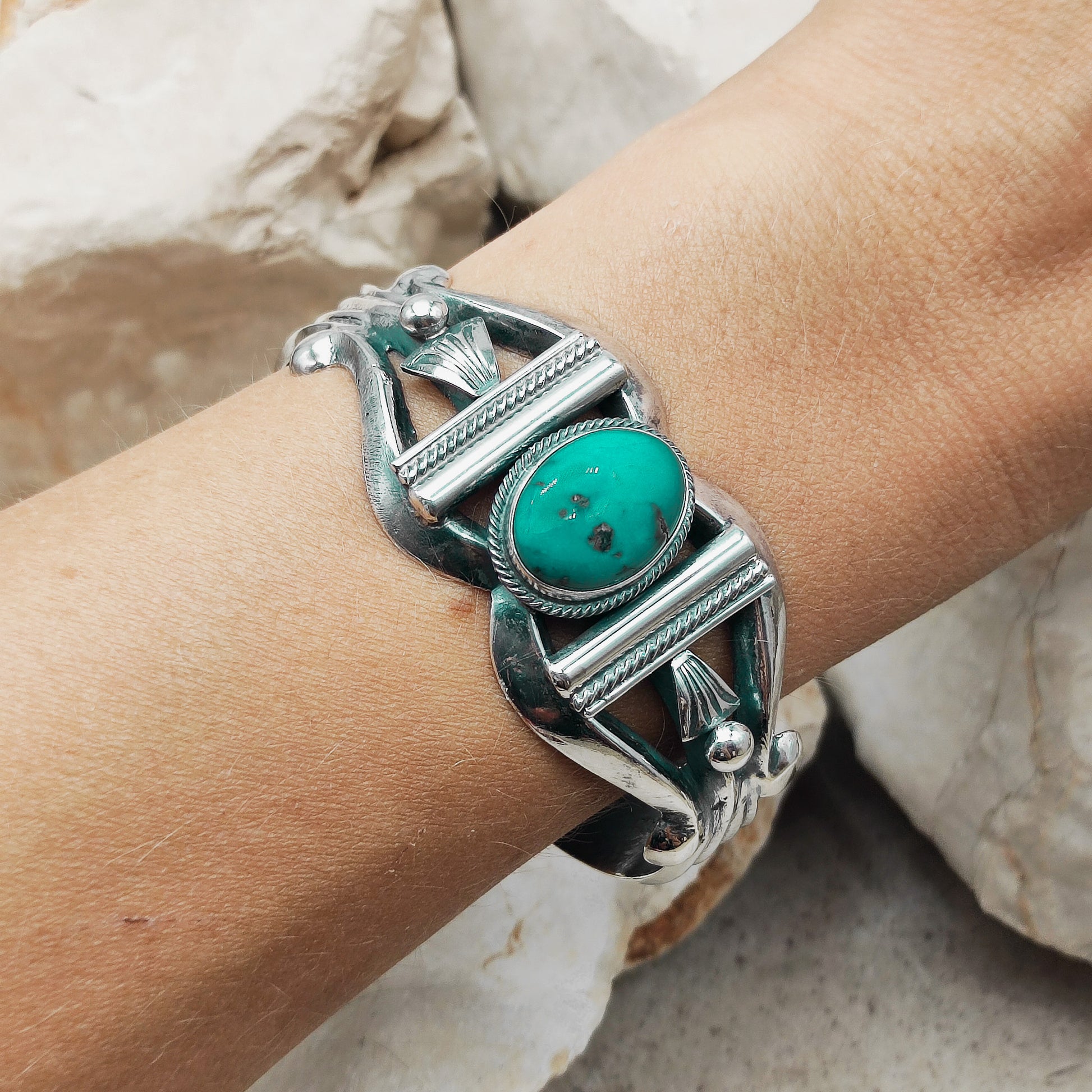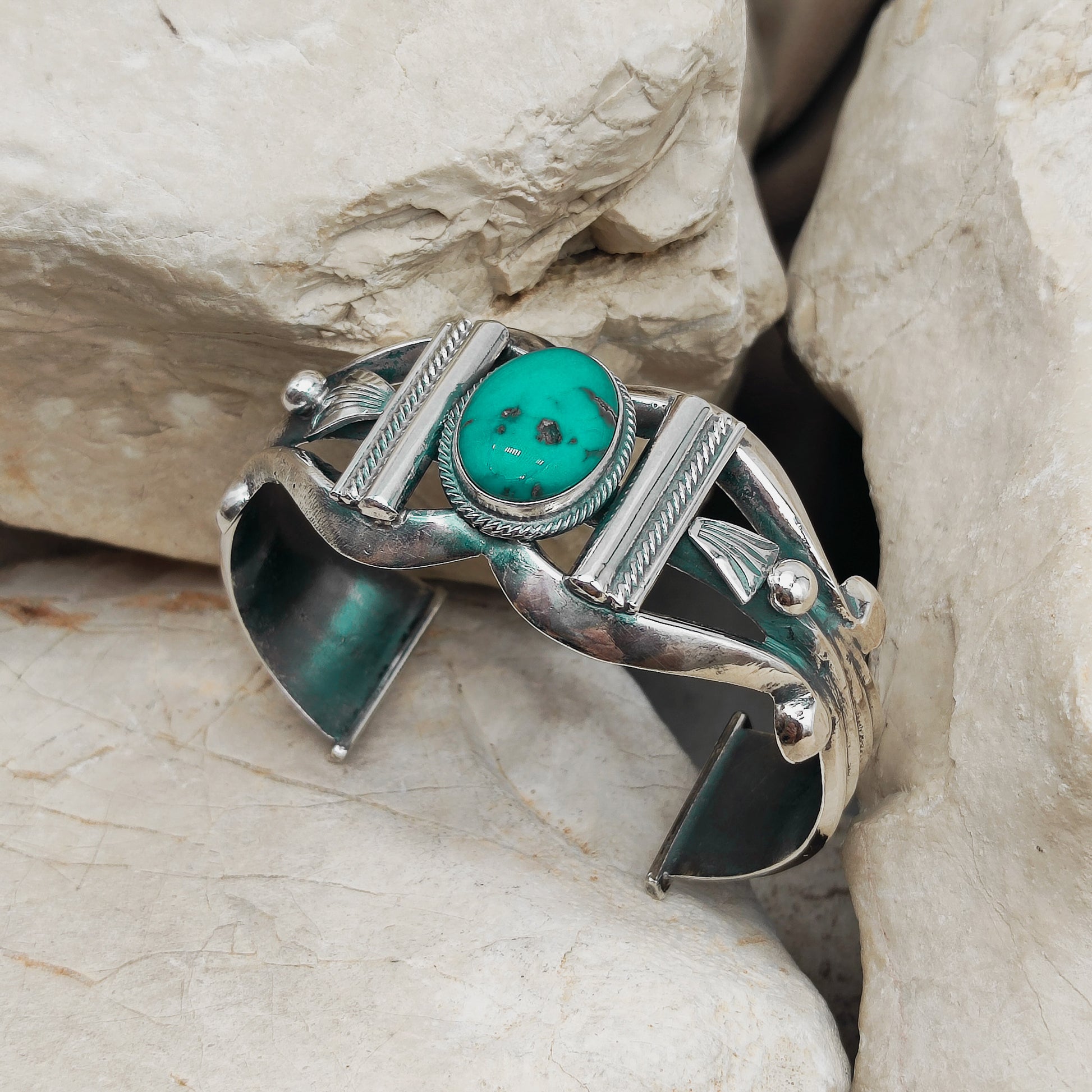 Deze armband werd wellicht gemaakt door gesmolten zilver in zand te gieten en nadien verder af te werken met meer details en de prachtige Turquoise!